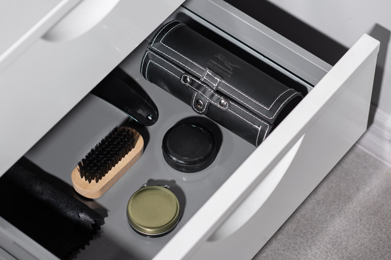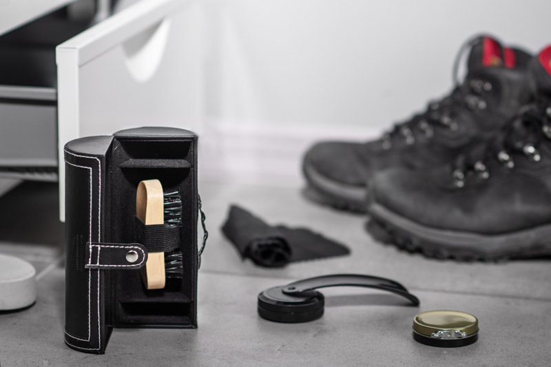 Shoe cleaning set SHINBO made of PU eco leather. Includes clear polish, cleaner, shoe spoon, cloth and brush.
