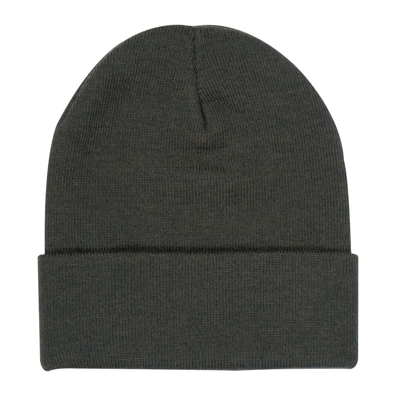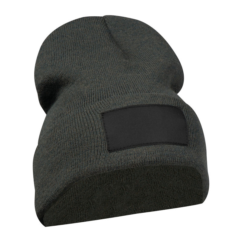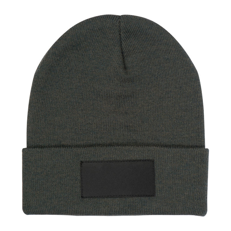 Knitted hat made from RPET and acrylic with a black patch. Suitable for almost all sizes thanks to the elasticated shape. We print your logo on the patch.