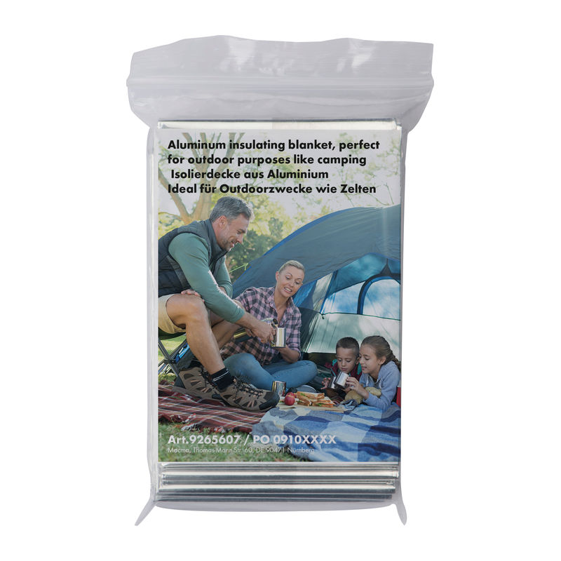 Aluminium insulating blanket with pouch. Perfect for picnics and camping because of its impermeability to water. Your logo will be printed on the outside of the pouch.