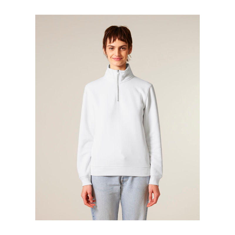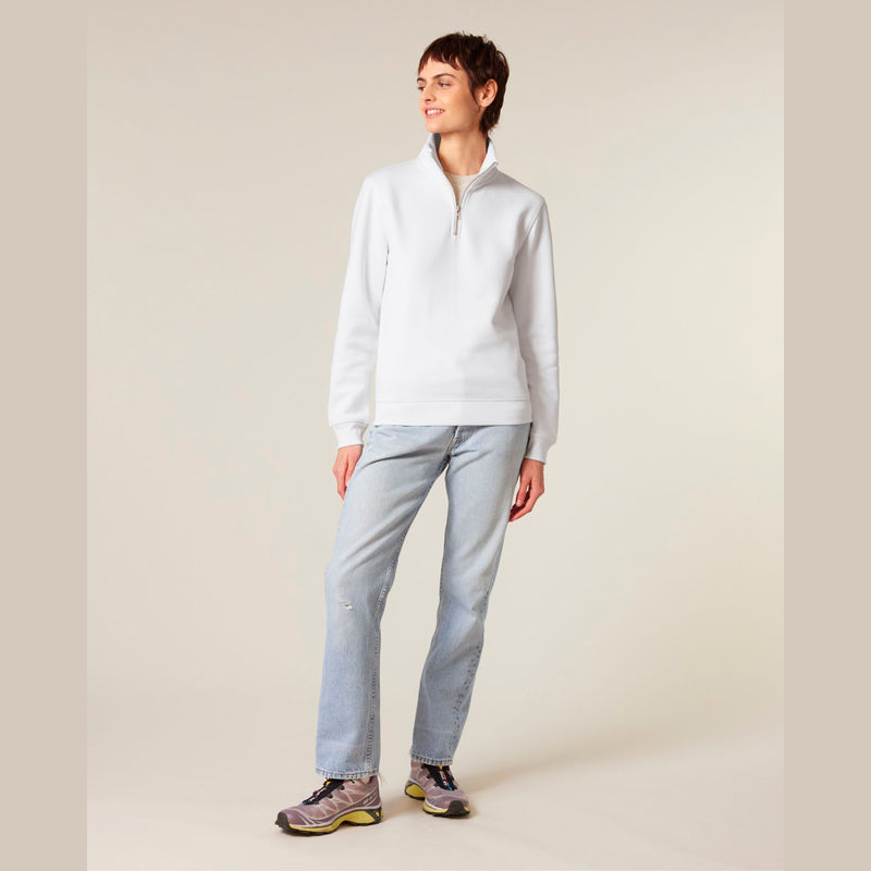 Unisex quarter zip sweatshirt with a modern fit. Made of 85% organic cotton, 15% recycled polyester. Ideal for branding with its premium comfort and inclusive sizing.