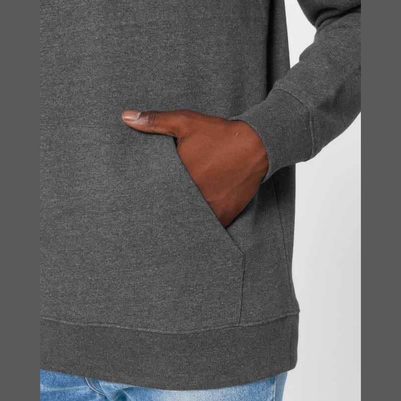 Eco-friendly hoodie made from organic cutting waste. Features a double-layered hood, kangaroo pocket, and metal accents. Stylish and sustainable with a unique textured feel.