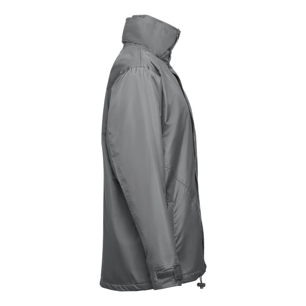 Padded parka (unisex) 100% polyester (exterior: 240 g/m² 100% polyester pongee 240 and waterproof PVC coating, interior: 65 g/m² 100% polyester taffeta, filling: 100% polyester 80 g/m²). Collar lined with black polar mesh fastened with a self-adhesive hook and loop closure. Foldable collar hood, adjustable with black stoppers. Opening with flap, coloured zip, self-adhesive hook and loop fastener and snap buttons in black. Features 2 outer pockets with flap and 2 inner pockets (1 for mobile phone) with hook and loop fastener. Inner 2x2 ribbed mesh cuffs and adjustable outer cuffs with adjustable hook and loop straps. Thermo-sealed seams. Zipped lower back access for easy customisation. Sizes: XS, S, M, L, XL, XXL