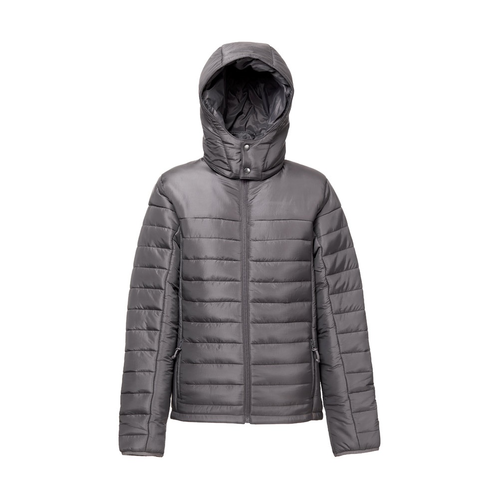 Women's hooded jacket in 100% recycled nylon ripstop (350 g/m²), the inside is lined in 100% recycled nylon taffeta (350 g/m²) for greater comfort when wearing it. The hood is padded and has different features: an elastic band, two snap buttons and a zipper that can be removed. Front opening with YKK® zipper - a brand that uses modern equipment with high quality control - and puller. It has two front pockets with zippers and pullers and two inside pockets with adhesive zippers. On the lower back there is a zippered access for easy personalization. Sizes: XS, S, M, L, XL, XXL