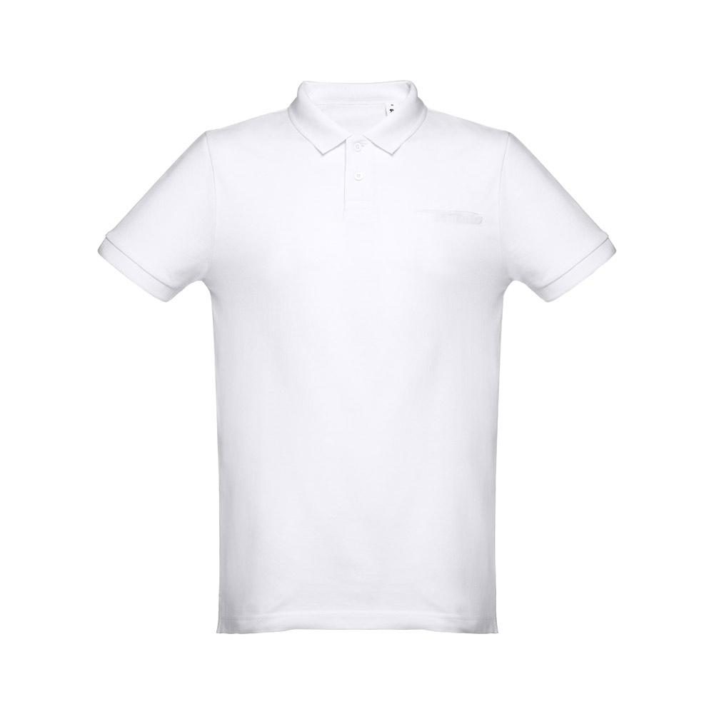 100% cotton pique men's short sleeve polo with carded cotton (195 g/m²). Elegant collar and rib sleeves, with a piqué reinforced collar. Reinforced placket with 2 matching colour buttons (extra button inserted in the inner seam). Modern cut with a single welted pocket on the chest. Cut and sewn piece with small side vents at the hemline of the polo. Sizes: S, M, L, XL, XXL