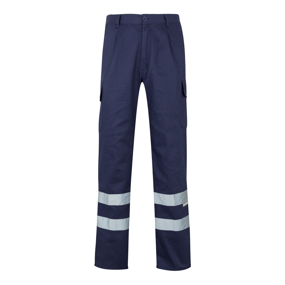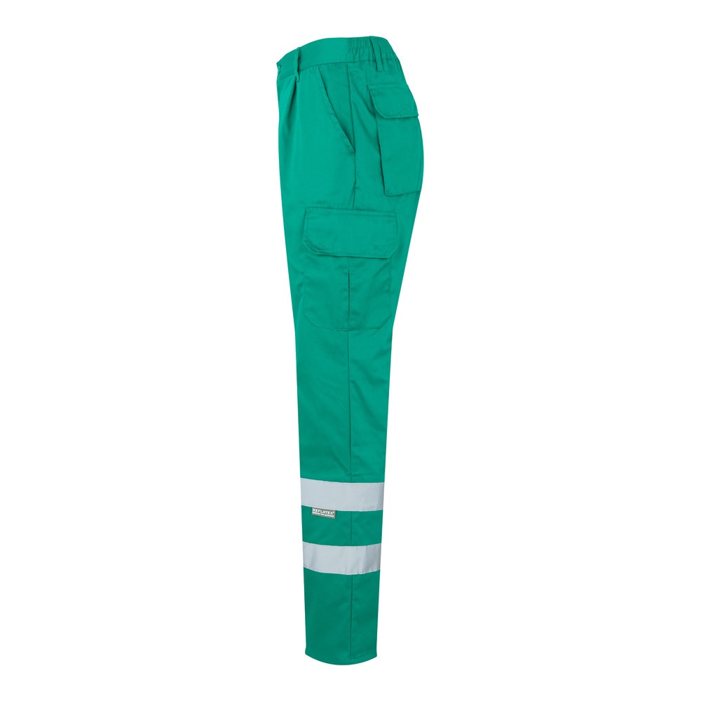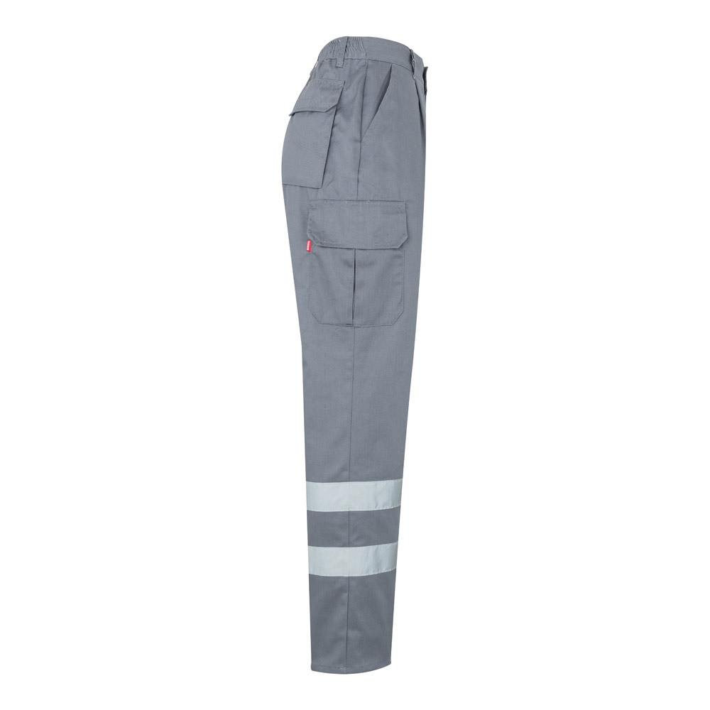 Multi-pocket twill trousers (200g/m²), in cotton (35%) and polyester (65%). With elasticated waistband, reflective stripes on the bottom of the trousers and six pockets (2 French pockets, 2 side gusset pockets and 2 back pockets). Product in compliance with EU Reg. 2016/425, certified by EN17353 and class Nº B2. Size: S, M, L, XL, 2XL, 3XL