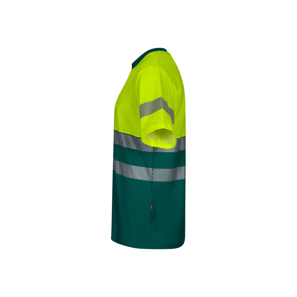 Two-tone piqué T-shirt (150g/m²), in cotton (55%) and polyester (45%). Short sleeves, with ribbed round collar in contrasting color, segmented reflective stripes on the torso and sleeves. Product in compliance with EU Reg. 2016/425, certified by EN20471 and class Nº 1. Size: S, M, L, XL, 2XL, 3XL