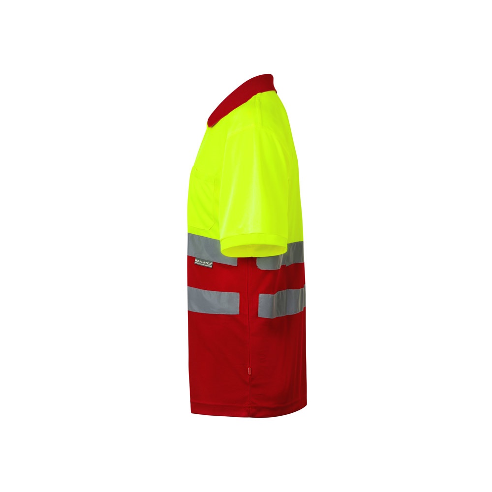 Two-tone bird-eye polo shirt (160g/m²) with short sleeves, in polyester (100%). Contrasting colour buttons and collar. Ribbed collar. Reflective stripes on the torso. Includes a chest pocket. Product in compliance with EU Reg. 2016/425, certified by EN20471 and class Nº 1. Size: S, M, L, XL, 2XL, 3XL