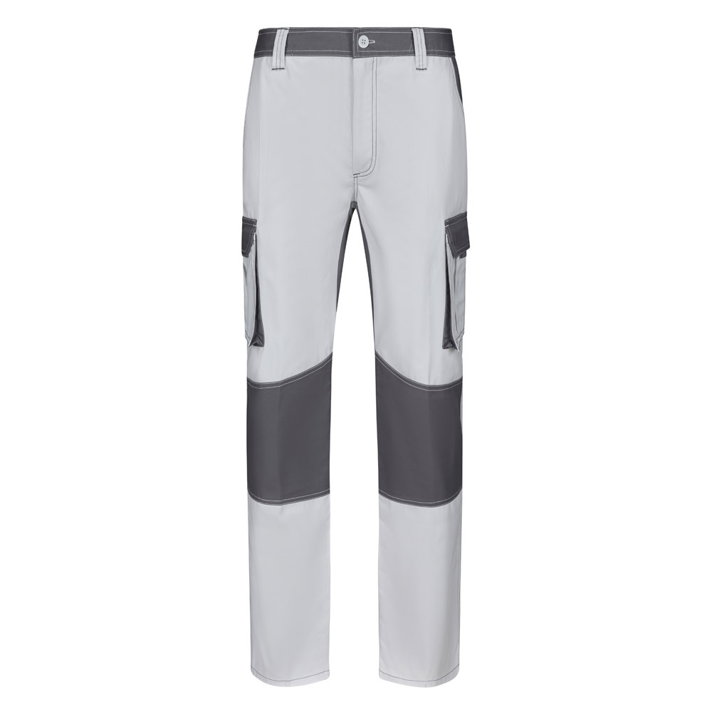 Two-tone multi-pocket twill trousers (240 g/m²), in cotton (35%) and polyester (65%). Slim Fit cut, elasticated waistband and fabric reinforcement on the knees and back. Contains six pockets (2 French pockets, 2 side gusset pockets and 2 back gusset pockets). Size: 34, 36, 38, 40, 42, 44, 46, 48, 50, 52, 54, 56, 58, 60