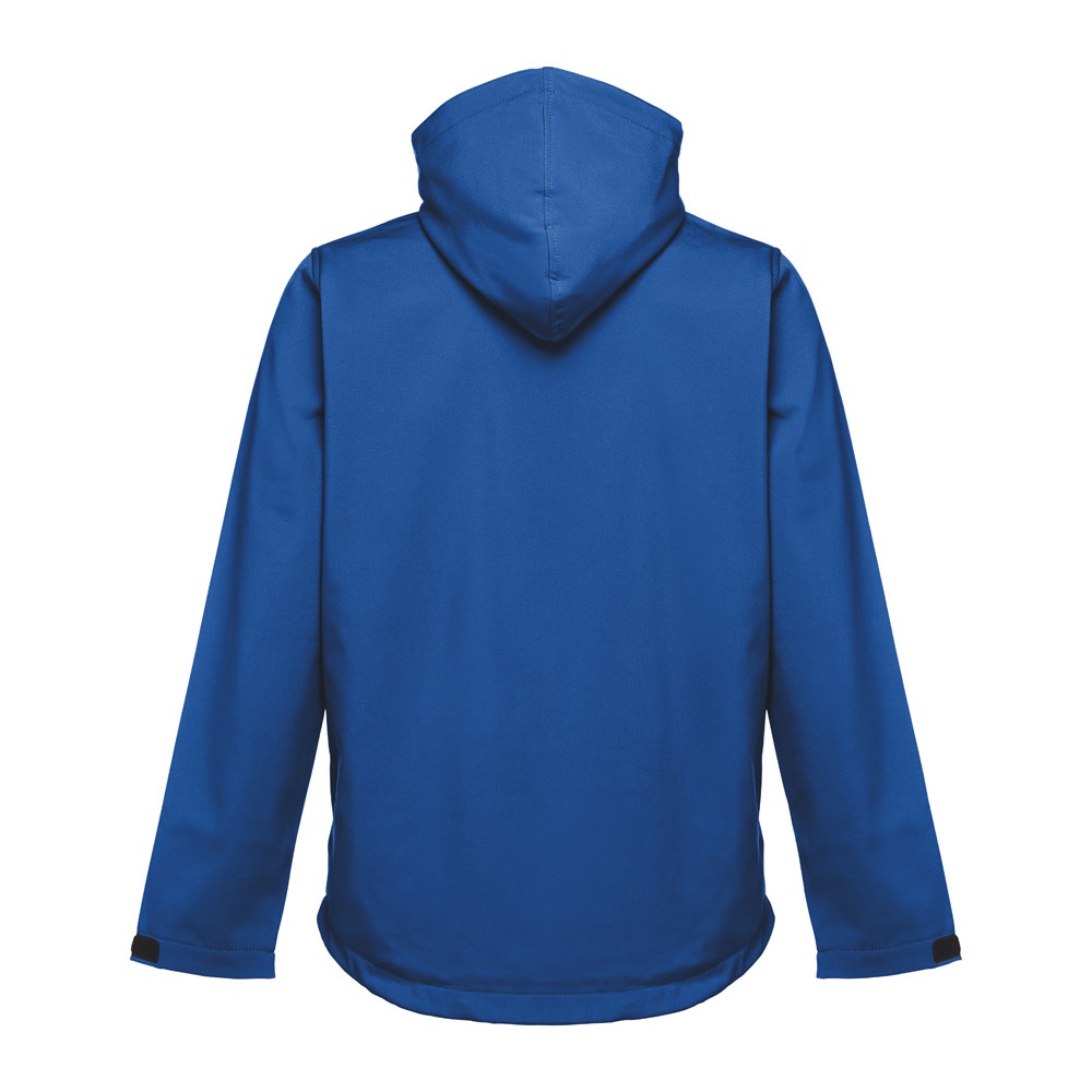 Softshell men's jacket in 96% polyester and 4% elastane (280 g/m²), with two layers, removable hood and water resistant coating. Fleece lined jacket with 2 front pockets and diagonal chest pocket, all with zips. Adjustable cuffs with self-adhesive hook and loop fastener. Removable hood with drawstring and self adhesive hook and loop fastener to attach to the collar. Rounded hem on the back. Sizes: S, M, L, XL, XXL