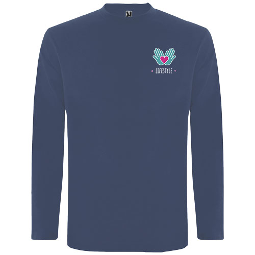 Long-sleeve t-shirt in tubular fabric and 4-layer crew neck. Reinforced covered seams in collar and shoulders. No cuffs. Removable label. Tubular design in adult sizes and side seams in kids sizes. The model is 185 cm and is wearing size L.