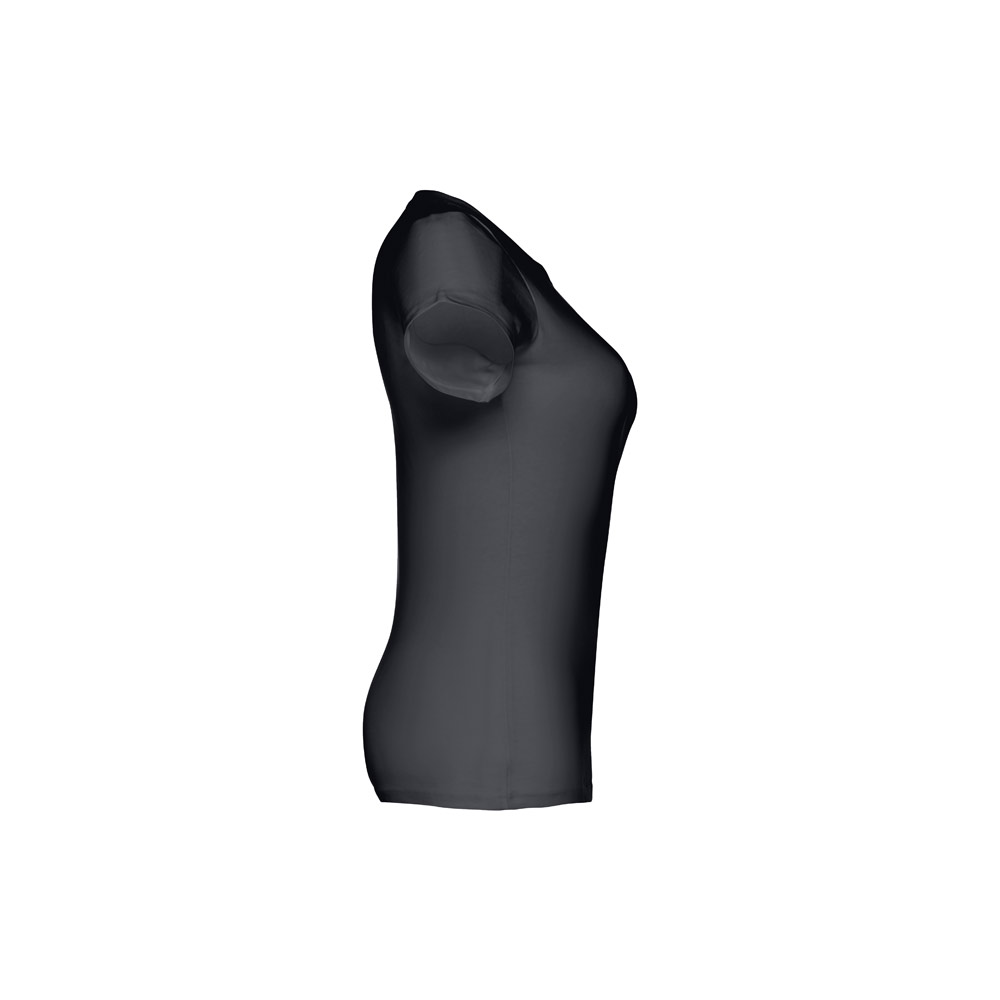 100% cotton jersey Women's fitted T-shirt (190 g/m²) with carded cotton yarn (colour 183: 90% cotton and 10% viscose). Features a thin jersey collar with satin ribbon reinforcement. Piece cut and sewn with double seam sleeve cuff and hemline. Sizes: S, M, L, XL, XXL