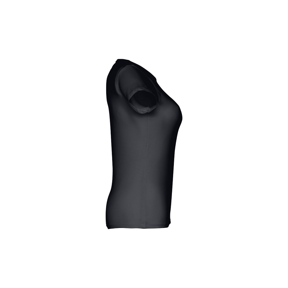 Women's fitted T-shirt in 100% cotton jersey (150 g/m²) with carded cotton yarn (colour 183: 90% cotton/10% viscose). Features a thin double jersey collar reinforced by satin bias tape. Cut and sewn garment with double stitched sleeve and hemline. Size: 3XL