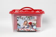 A multitude of different creative materials for craft projects. stored in a plastic box with metal clasps and with a convenient handle on the lid,. Contents: Cardboard, glossy paper, glitter paper, star strips, styrofoam, glue, Foam Clay, chenille, string, beads, pompons, stickers, eyes and nose, and templates. Craft Box Set, size 34x24x20 cm, 1 pc