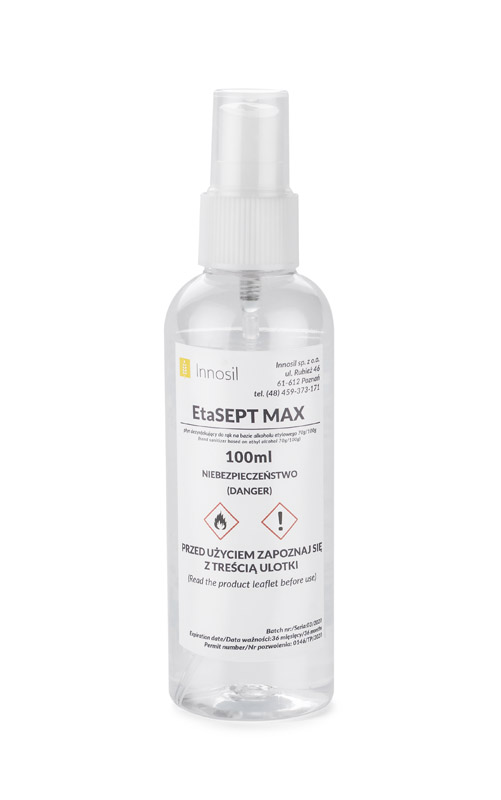 EtaSEPT Max disinfecting liquid with a capacity of 100 ml, intended mainly for disinfecting the surface of the hands. Made on the basis of alcohol, glycerin and water. The liquid contains 70% ethyl alcohol!