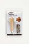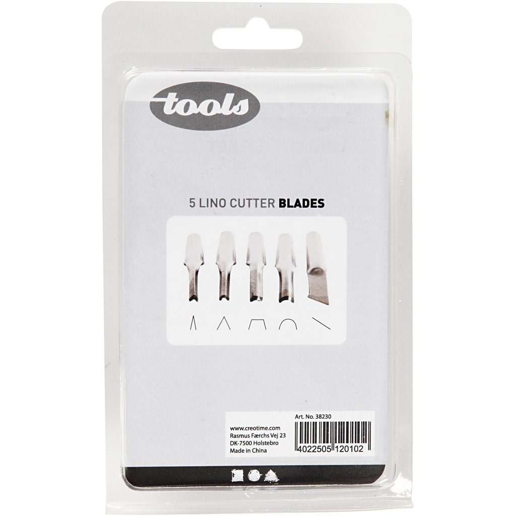 Linoleum blades with different shapes and lengths that are inserted into a wooden handle. Mostly used to cut out a design in a linoleum or rubber printing block. Linoleum Cutting Set, 5 asstd./ 1 set