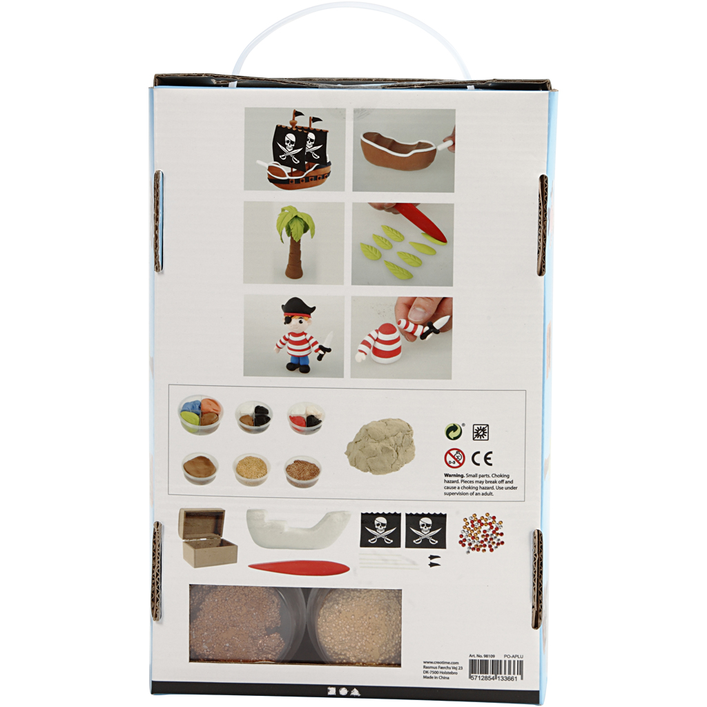 Creative kit containing many different creative materials. Inspiration and guidance included. Contents: Foam Clay and Silk Clay in several colours for the pirate ship, palm and pirate. Plus treasure chest in wood, rhinestones to create a 'secret treasure' and Sandy Clay to make a 'desert island'. Pirate World, 1 set