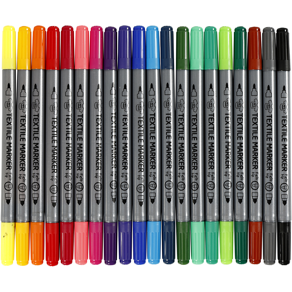 Permanent textile markers with two different felt tips at each end, which you can use to decorate new and old textiles. Textile markers, standard colours, line 2,3+3,6 mm, 20 pc/ 1 pack