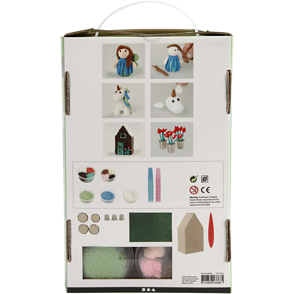 Creative kit containing many different creative materials. Inspiration and guidance included. Contents: Foam Clay and Silk Clay in several colours to make fairy, unicorn and toadstools. Plus glitter glue, small wooden discs, glitter foam rubber to create the 'forest floor', thimbles as 'pots' and a house of papier mache. The fairy world, 1 set