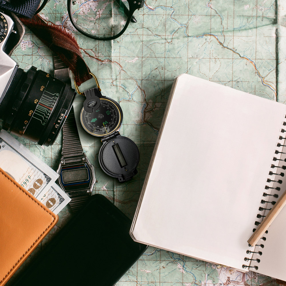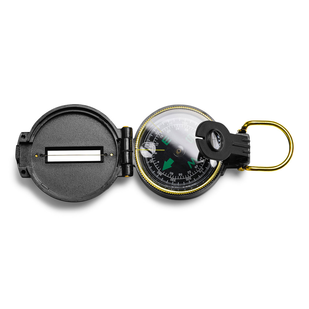ABS compass with observation slot on the lid and magnifying glass. Gold details. ø55 x 25 mm