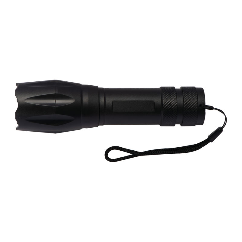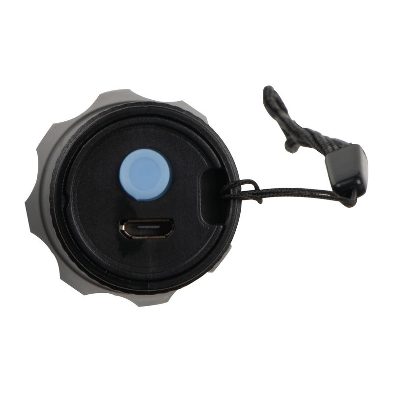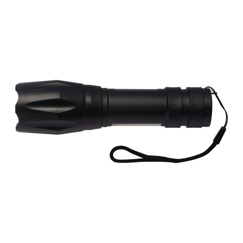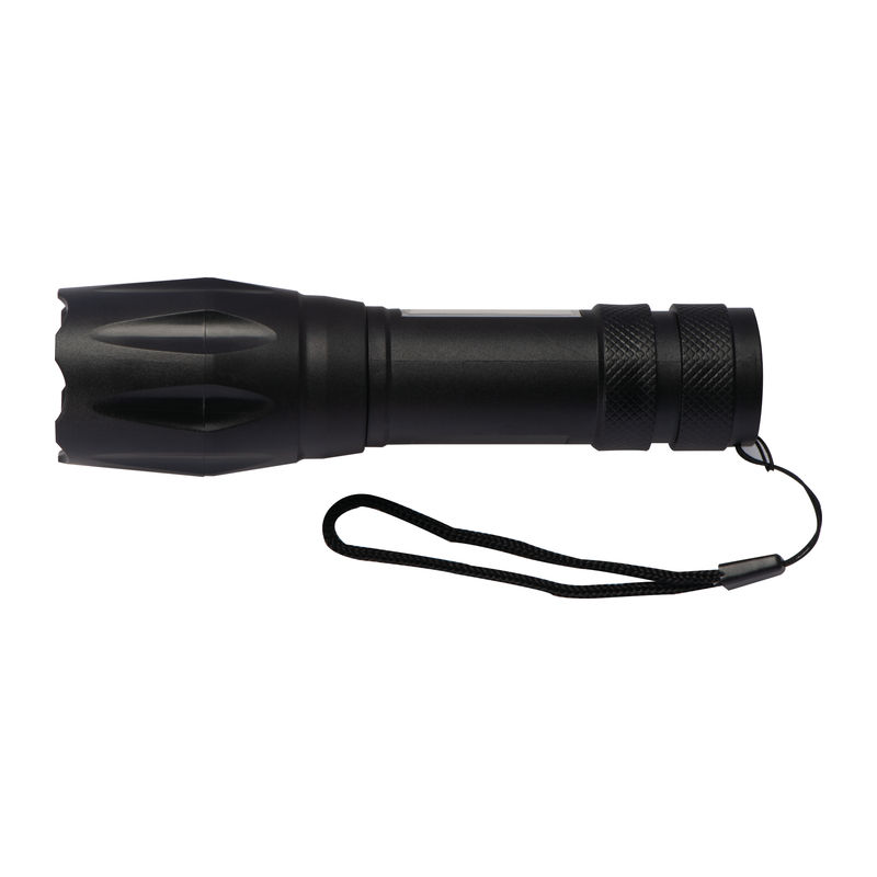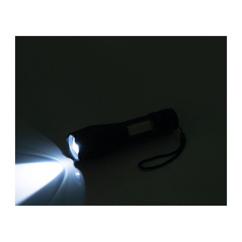 Rechargeable torch (3W, 150 lumens) with 600mAh battery and additional side light (3W, 130 lumens). The torch has three light modes and is supplied with a charging cable. Your logo will be printed on the torch.