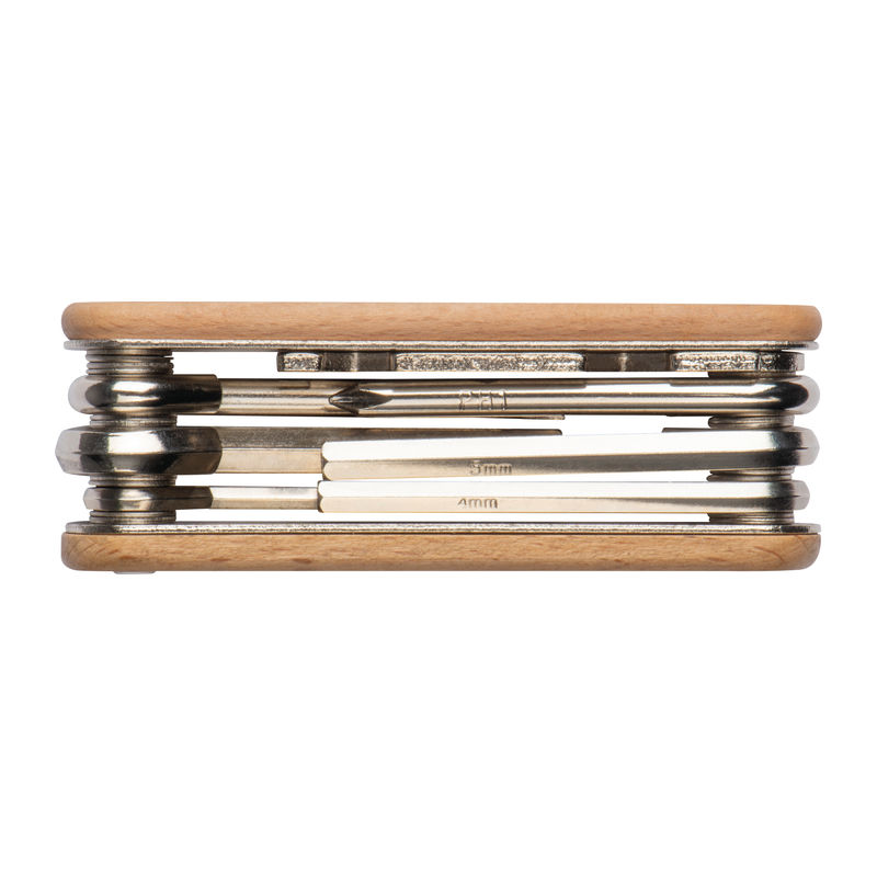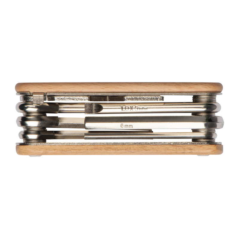 Bicycle tool made of metal and wooden casing. The small, handy tool should not be missing on the next bike tour. We laser your logo onto the wooden casing.