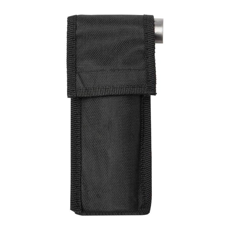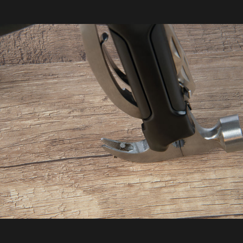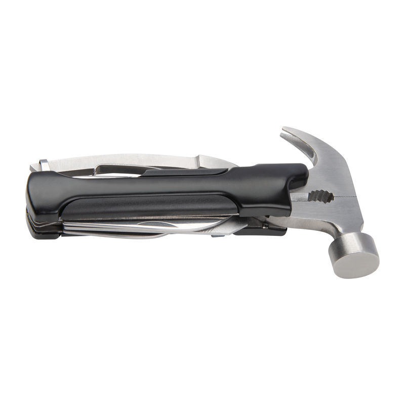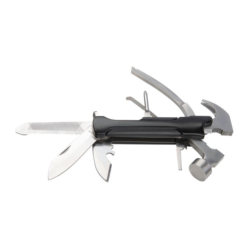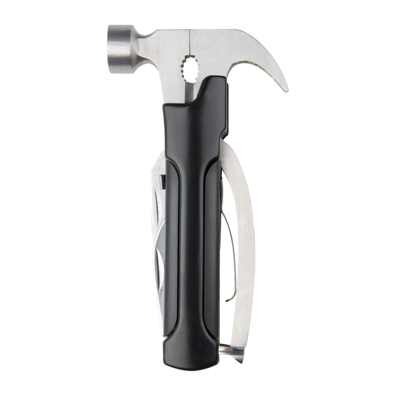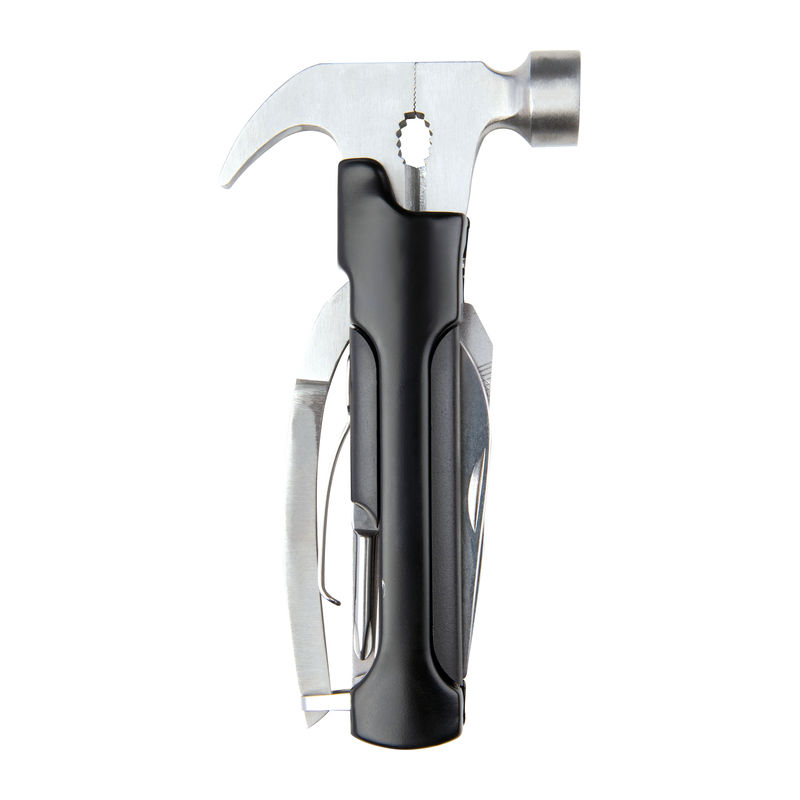 Multifunctional tool featuring two blades, a file, saw, slotted screwdriver, and bottle opener; also serves as a fully functional hammer.