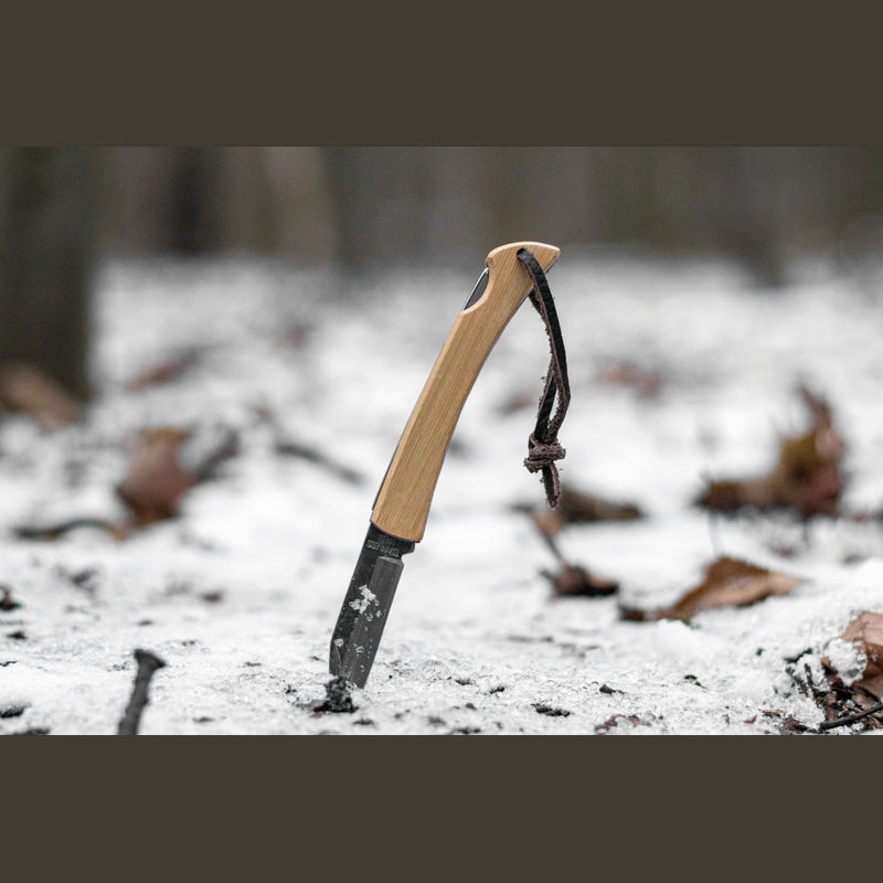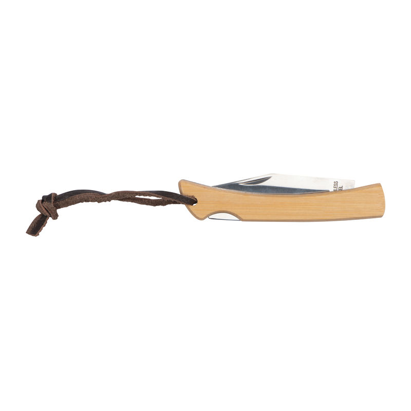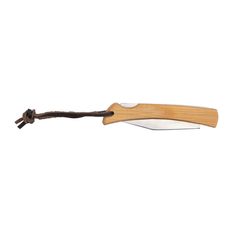 Stainless steel pocket knife with bamboo grip zone, safety lock and a hanging loop. We will laser-engrave your logo on the bamboo grip zone.