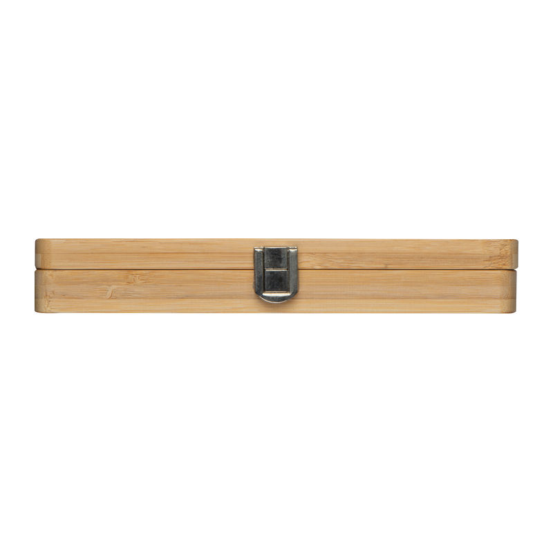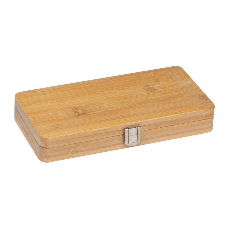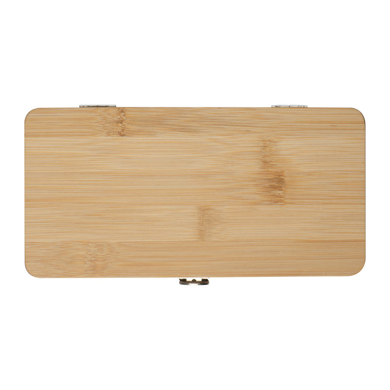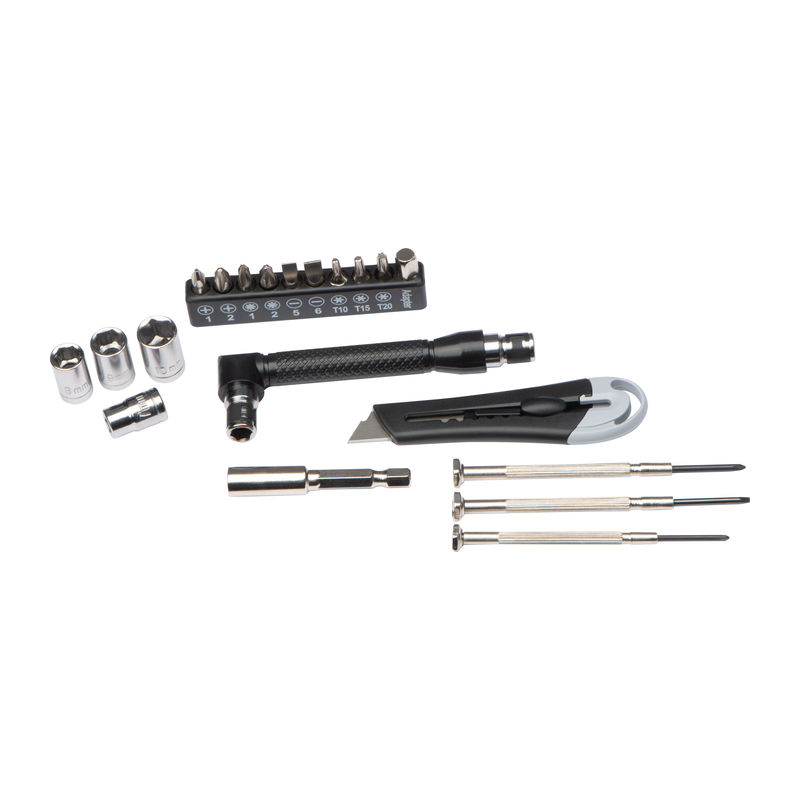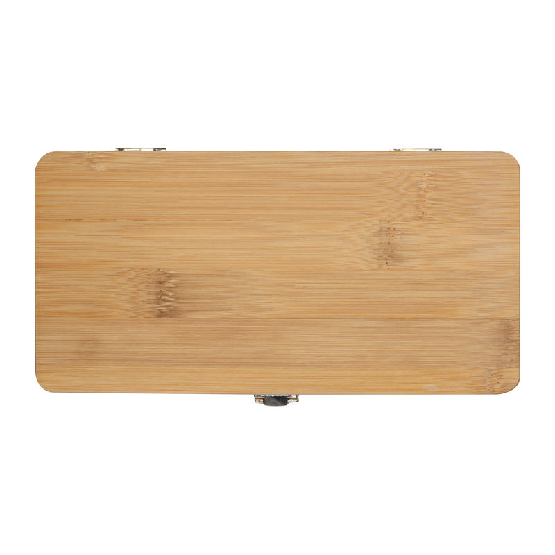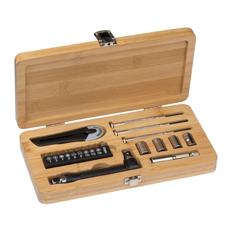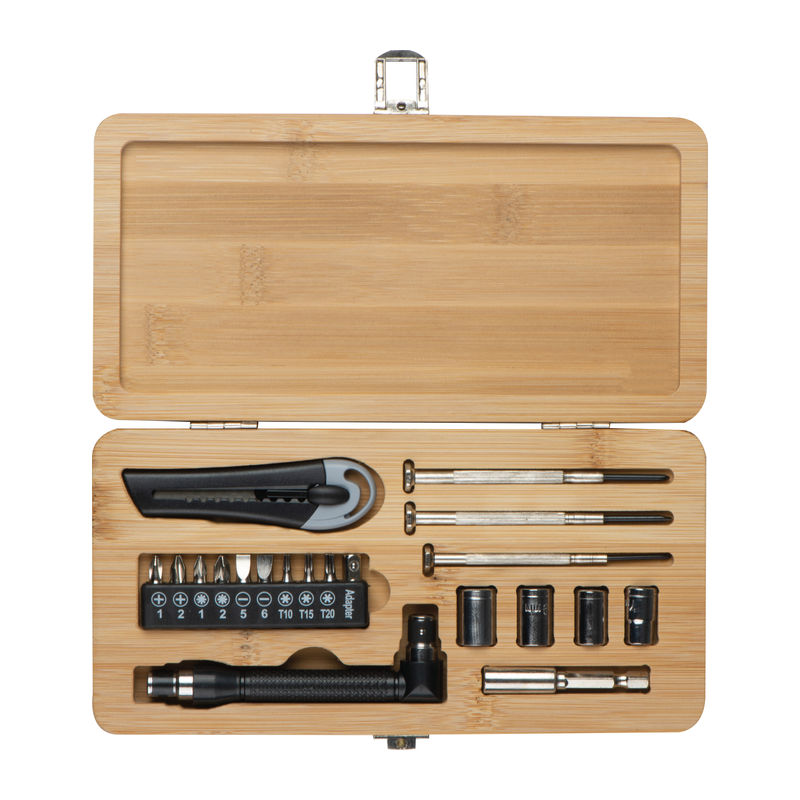 A 21-piece tool set comprising three screwdrivers, assorted bits with adapter, a cutter, and four hexagonal keys, all housed in an elegant bamboo case.
