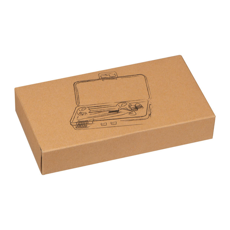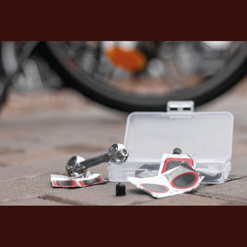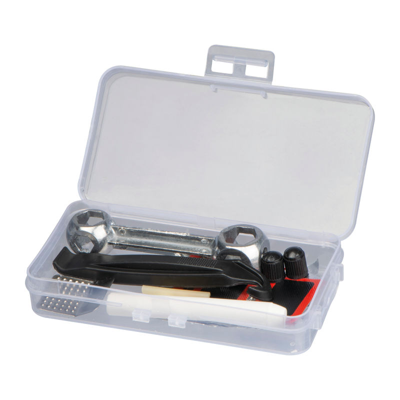Bicycle repair kit consisting of 2 valves, 1 sandpaper, 2 tire levers, 2 valve caps, 2 tire levers, 5 patches and a wrench. We will print your logo onto the box.