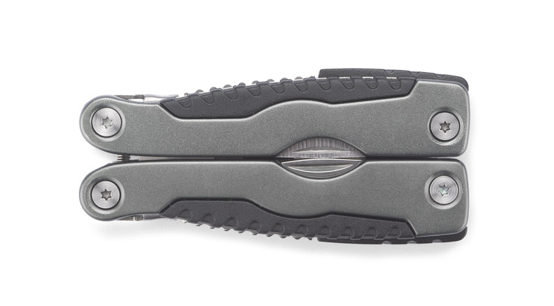 Multi function metal tool with metal handles. Packed into a sackcloth pouch that might be attached to belt. Tool consists of pliers, wood saw, can and bottle openers, wood and metal pile, Tool consists of pliers, wood saw, can and bottle opener, metal and wood file, flat and cross screwdrivers and two knifes (flat and serrated). Logo will be engraved on handles.