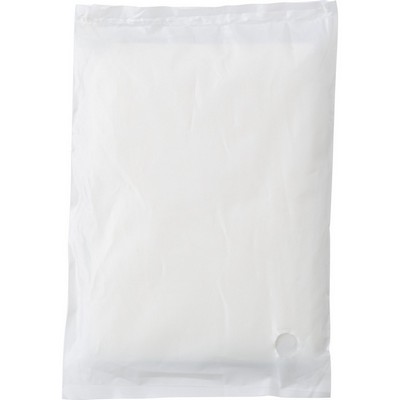 Foldable poncho with hood in transparent casing, made of compostable PLA