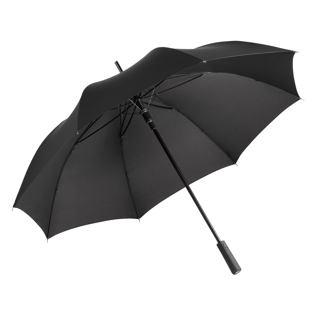 Convenient automatic function for quick opening, windproof features for higher frame flexibility and stability in windy conditions, frame with lotus shaped fibreglass rib construction for extra stability, lightweight and sturdy aluminium shaft in black, water and dirt-repellent cover properties through original Teflon™ fabric protector, Soft-Touch handle with integrated push-button and promotional labelling option, large, accommodating diameter