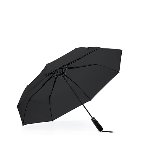 Foldable umbrella with automatic opening. 190T pongee fabric with matching pouch. EVA handle and black metal ribs.