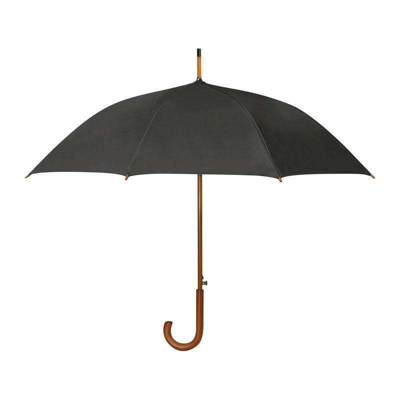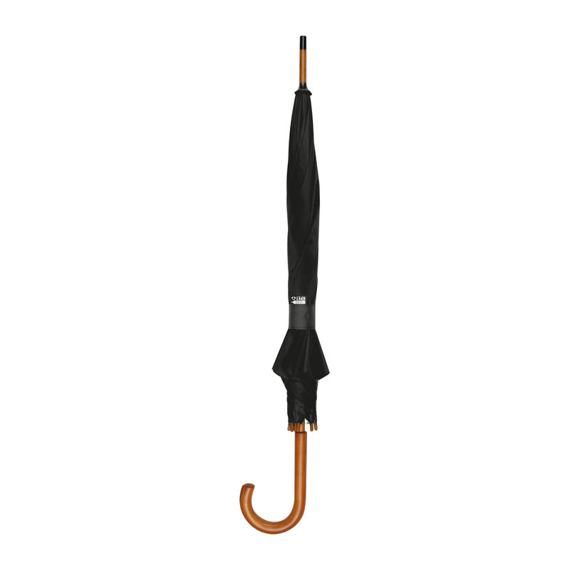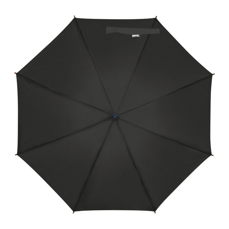 Automatic, windproof Umbrella with metal shaft, conopy made of recyceled PET bottles and curved wooden handle. Your logo will be printed on one segment.