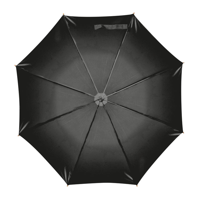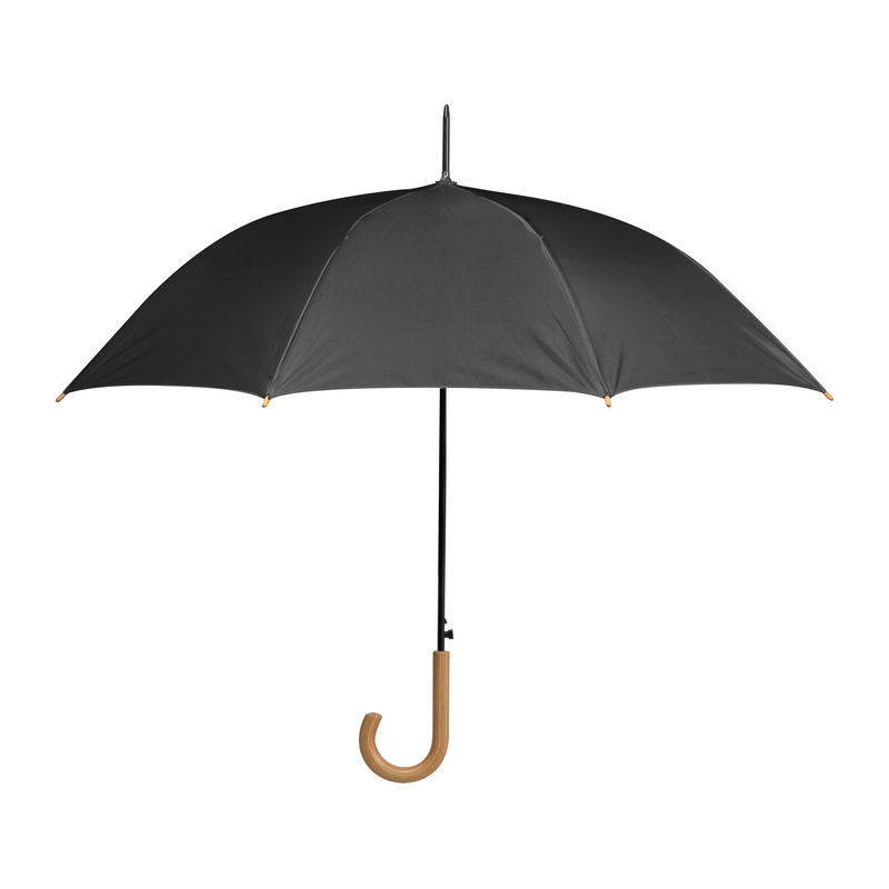 Automatic umbrella made of 190T polyester with curved wooden handle and wooden tips. Your logo will be printed on the lower part of one segment.