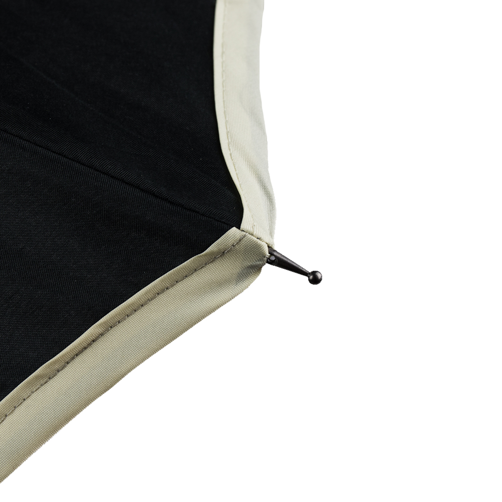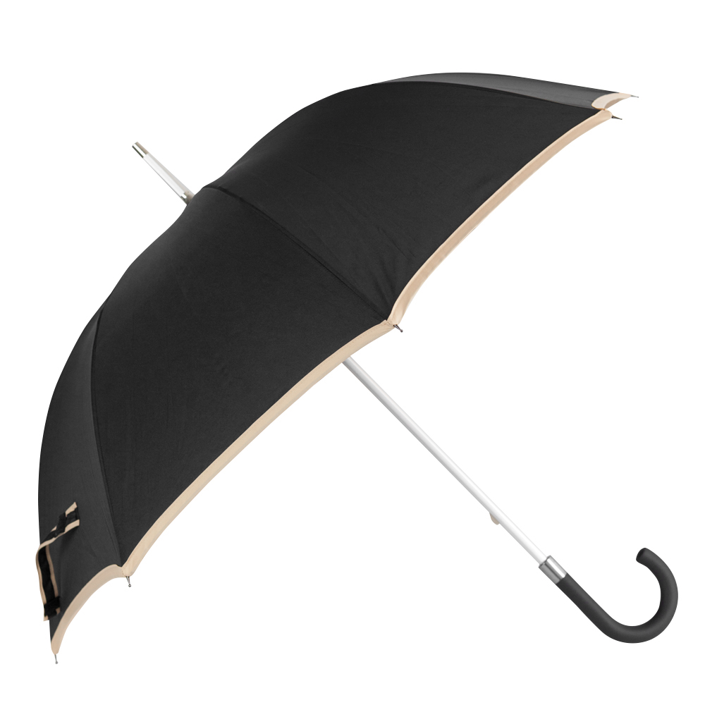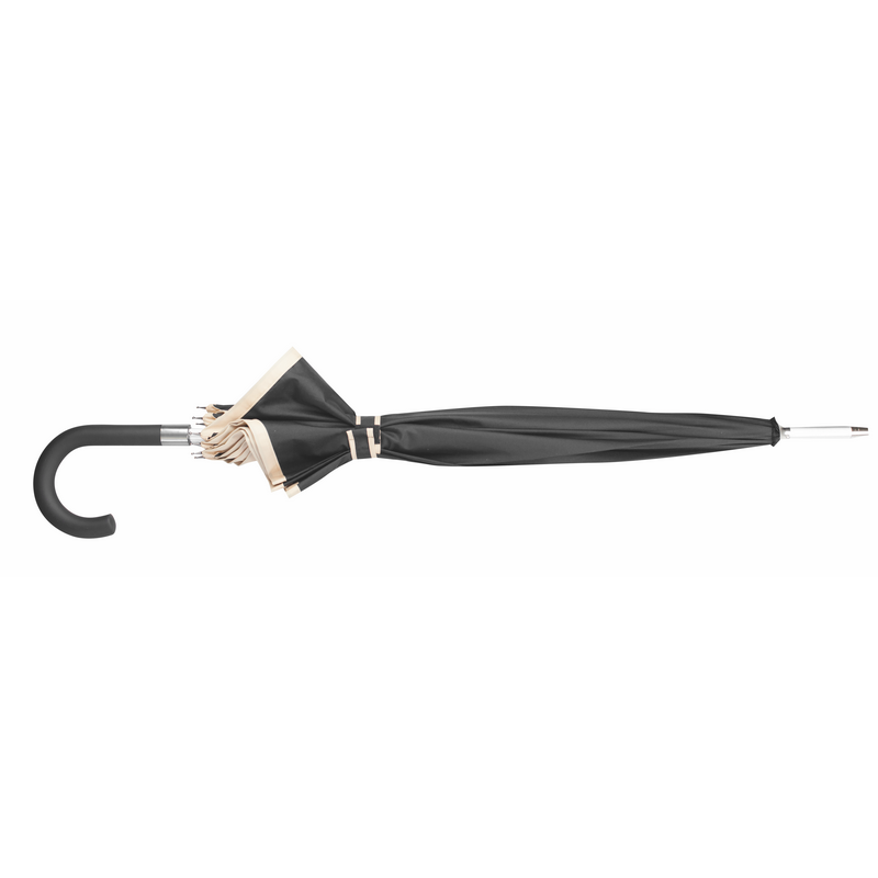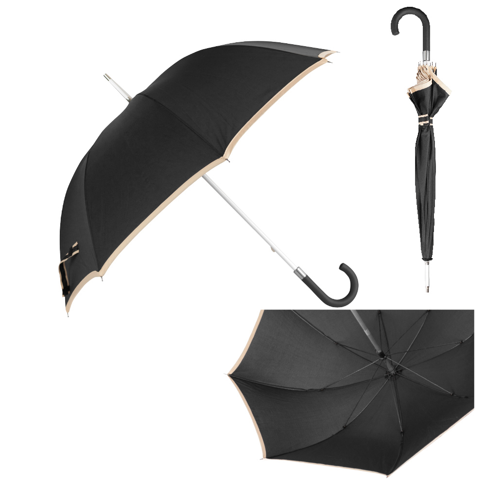 8-panelled umbrella with manual opening in pongee. In black colour with beige edging, aluminiuim body and fibreglass bars.