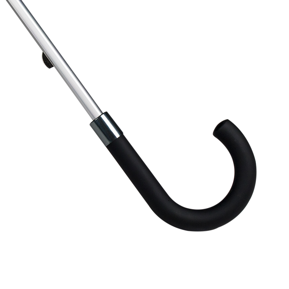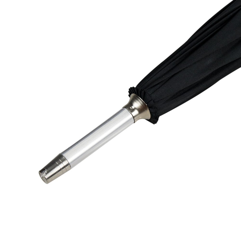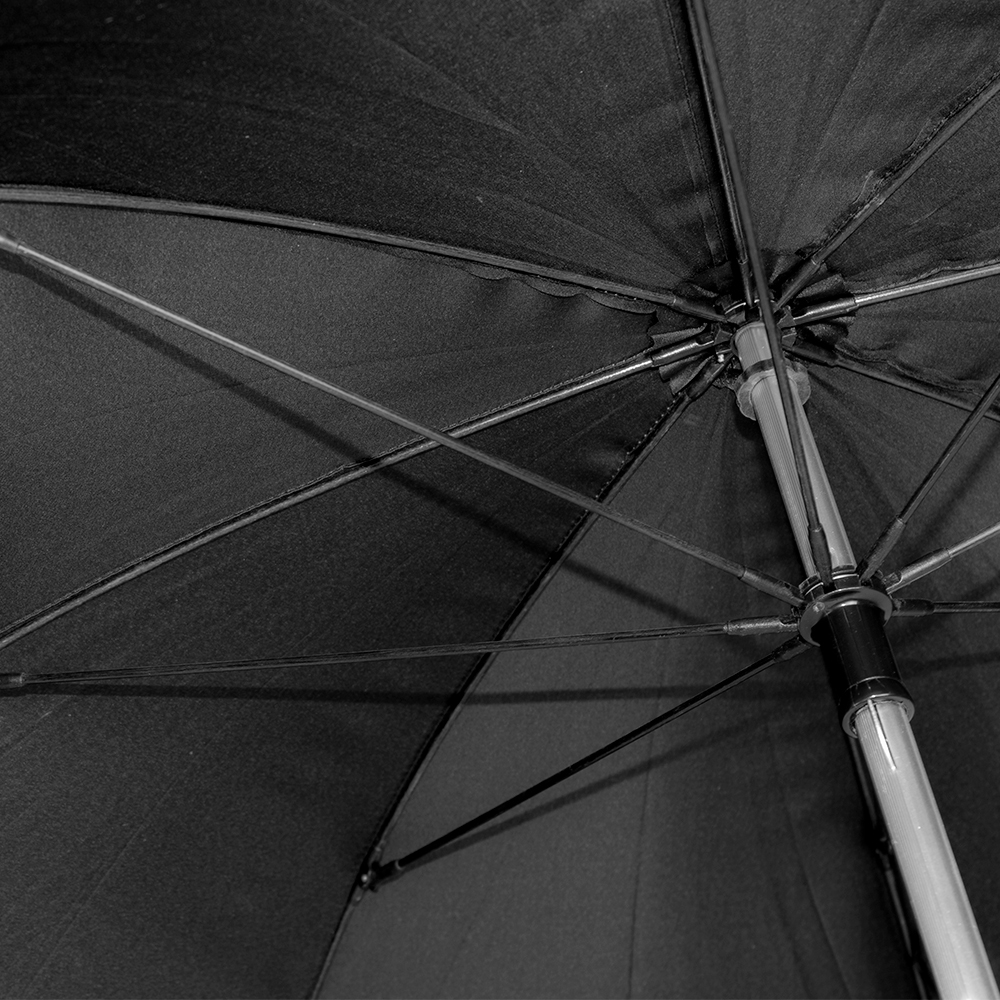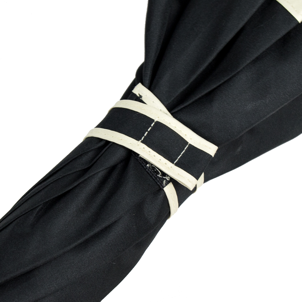 8-panelled umbrella with manual opening in pongee. In black colour with beige edging, aluminiuim body and fibreglass bars.