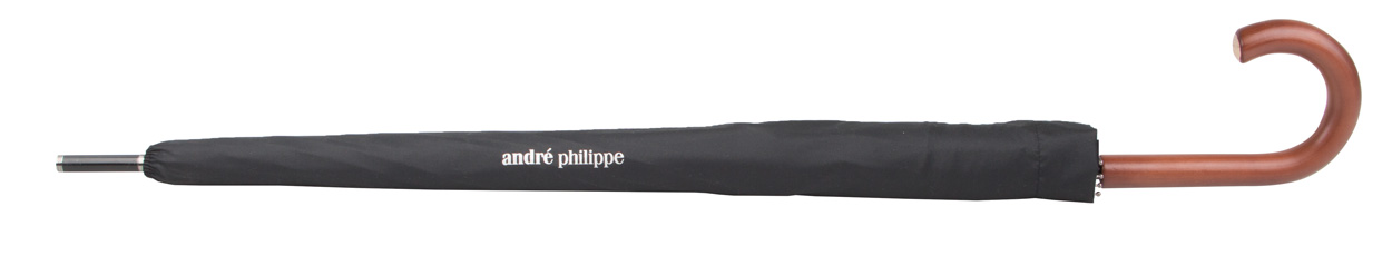 Automatic, windproof, black and grey striped umbrella with 8 panels, wooden handle, metal shaft and fibreglass ribs. 190T pongee. In branded carry case. André Philippe brand product.