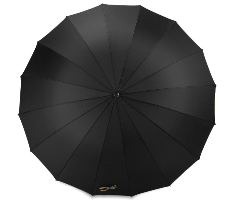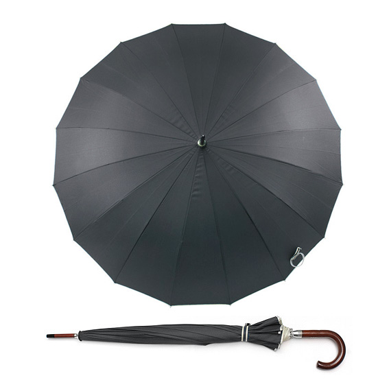 Very elegant manual umbrella, with 16 panels, ended with curved wooden handle. Its diameter when unfolded is equal to 112 cm, total length after folding is 90 cm. One panel width is 22 cm. Logo might be silk-screen imprinted.