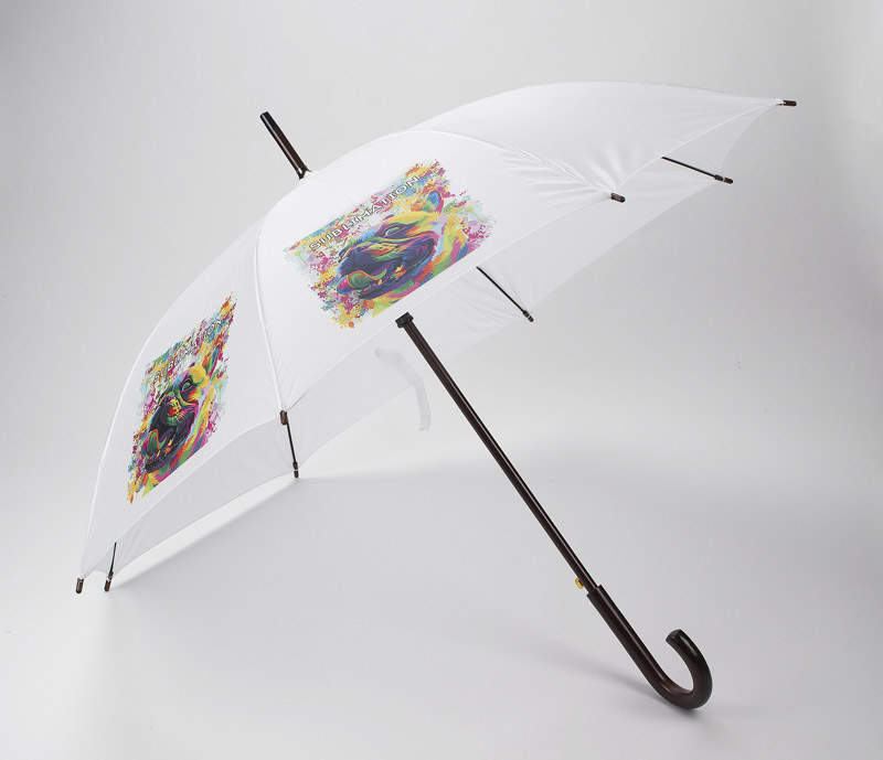 Automatic opening umbrella with a wooden curved handle. Open umbrella has 104cm diameter, length of the composed umbrella is 88 cm.