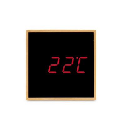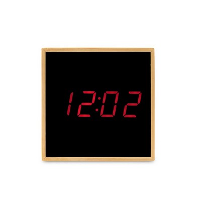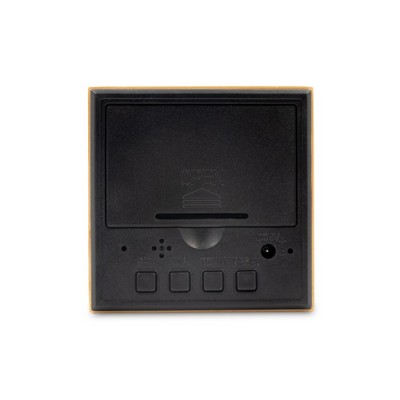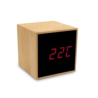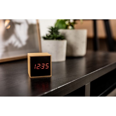 Bamboo desk clock, LCD display, powered by cable (included) 5V 500 mA, alternative power source for several hours of use: 3 AAA batteries (not included), CR2032 battery to maintain settings when disconnected from the power supply (included), functions: time, date, temperature, alarm (possibility to set 3 alarms for 3 different hours)