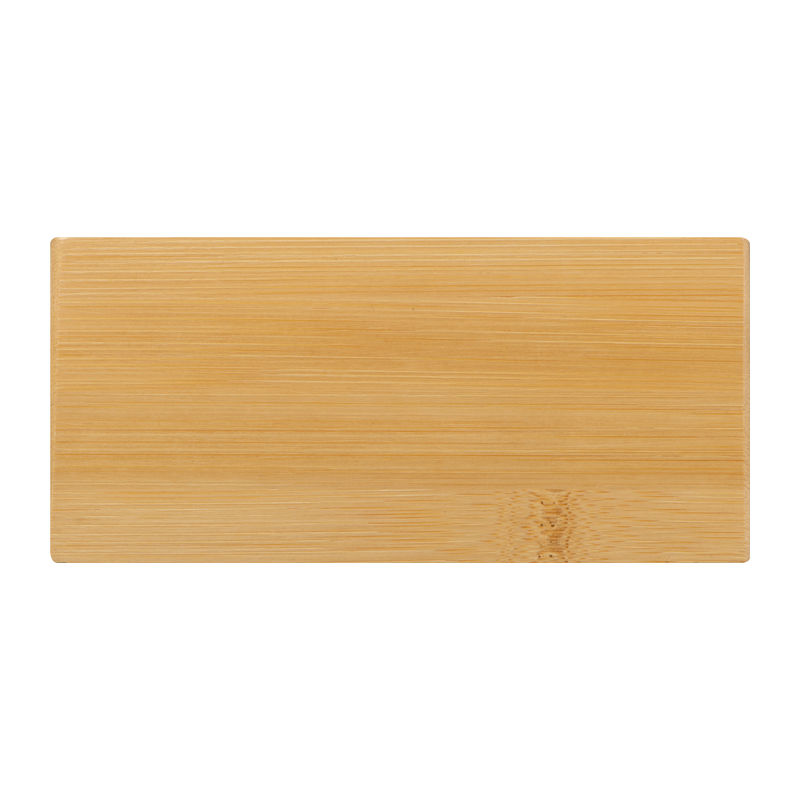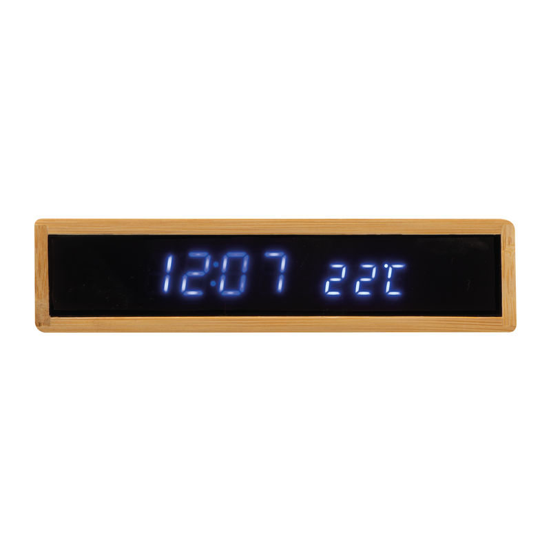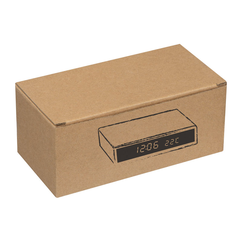 Digital desk clock crafted from bamboo, featuring an LED display, wireless charging capability, alarm function, and temperature indication. Each item and engraving is unique due to the natural bamboo material.