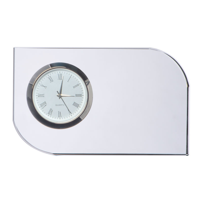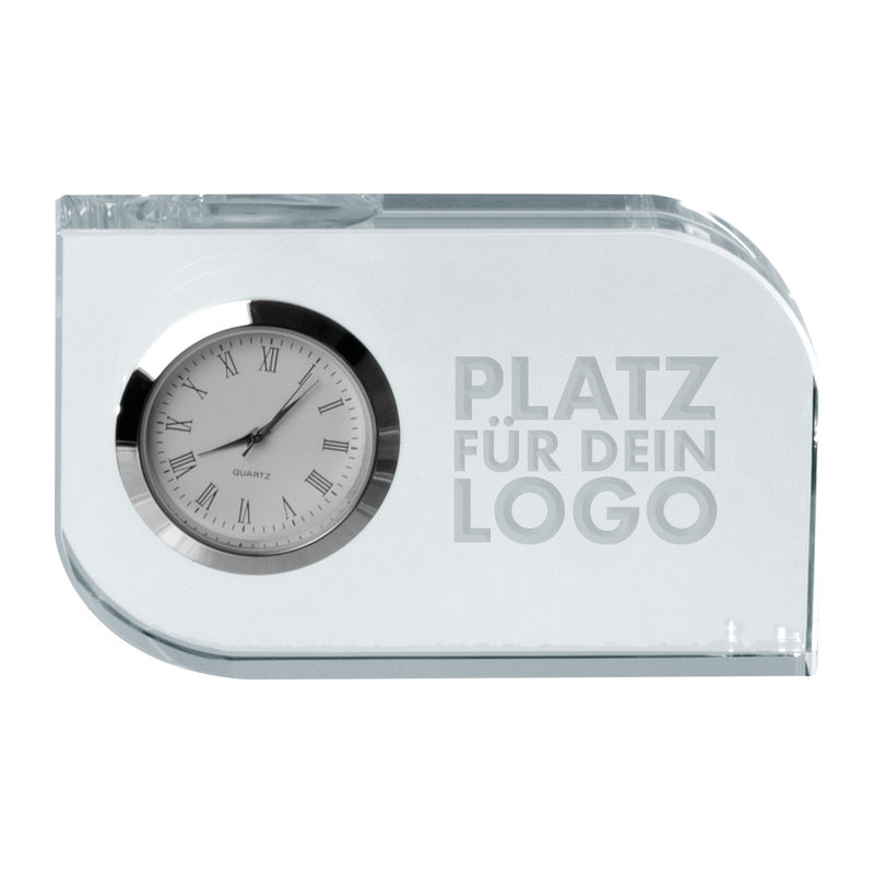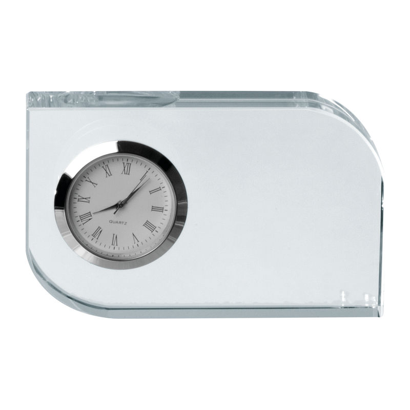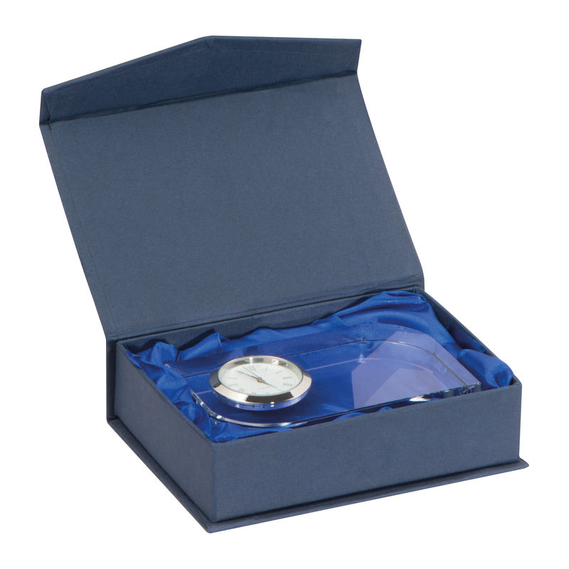 Elegant glass desk decoration with a small clock and space for your branding, which will be engraved directly onto the glass. Safely packed in a blue box* with satin inlay.