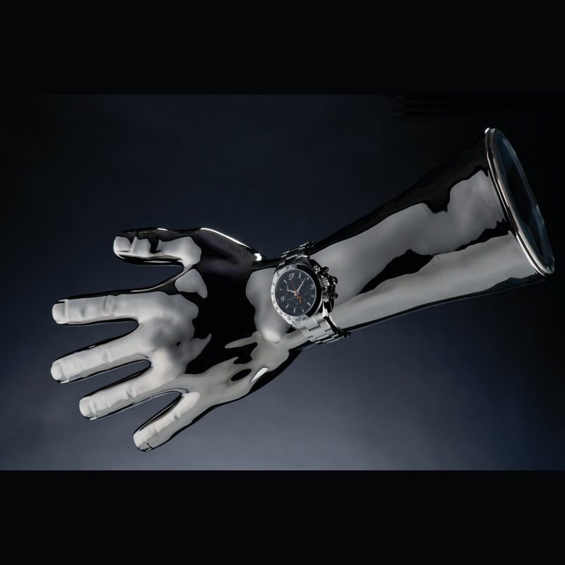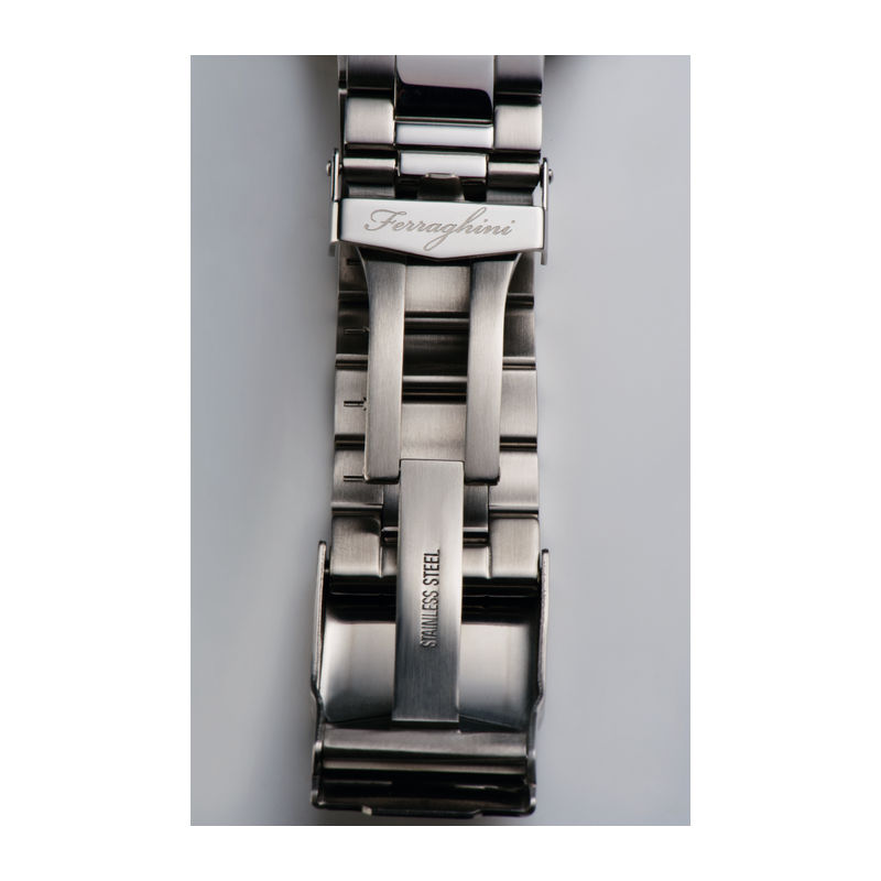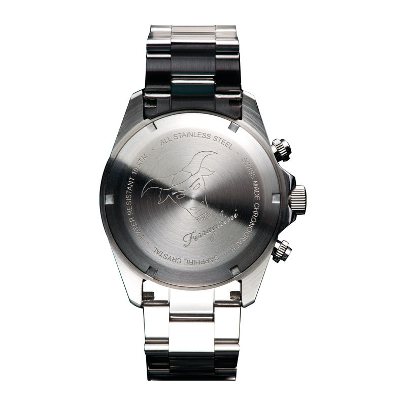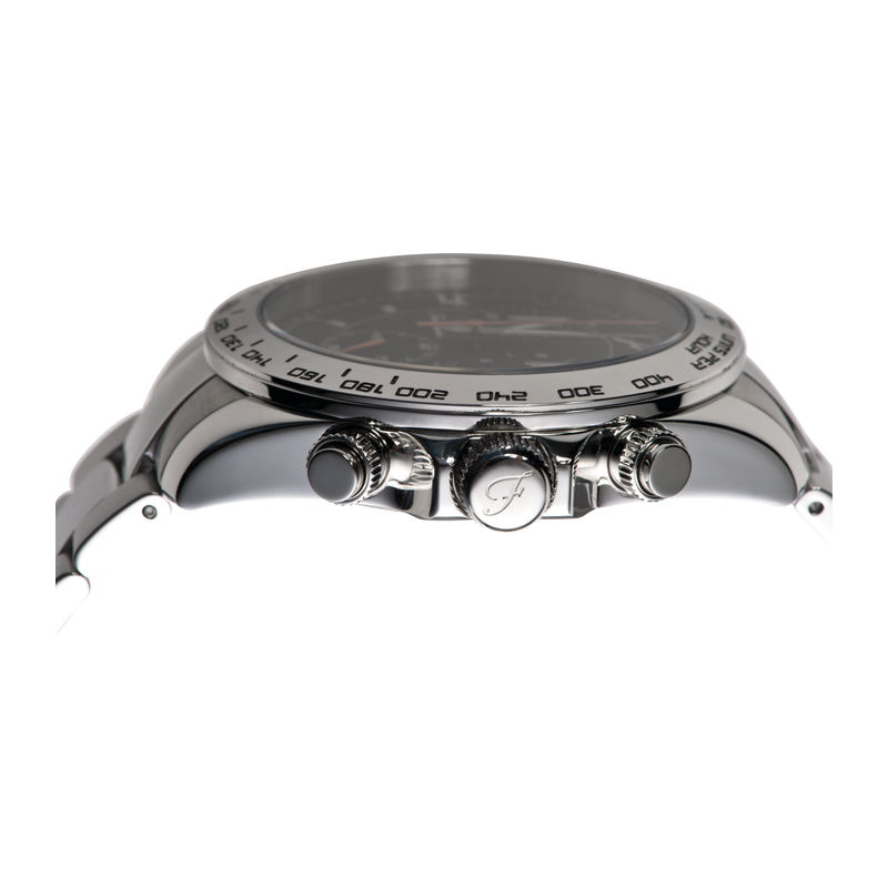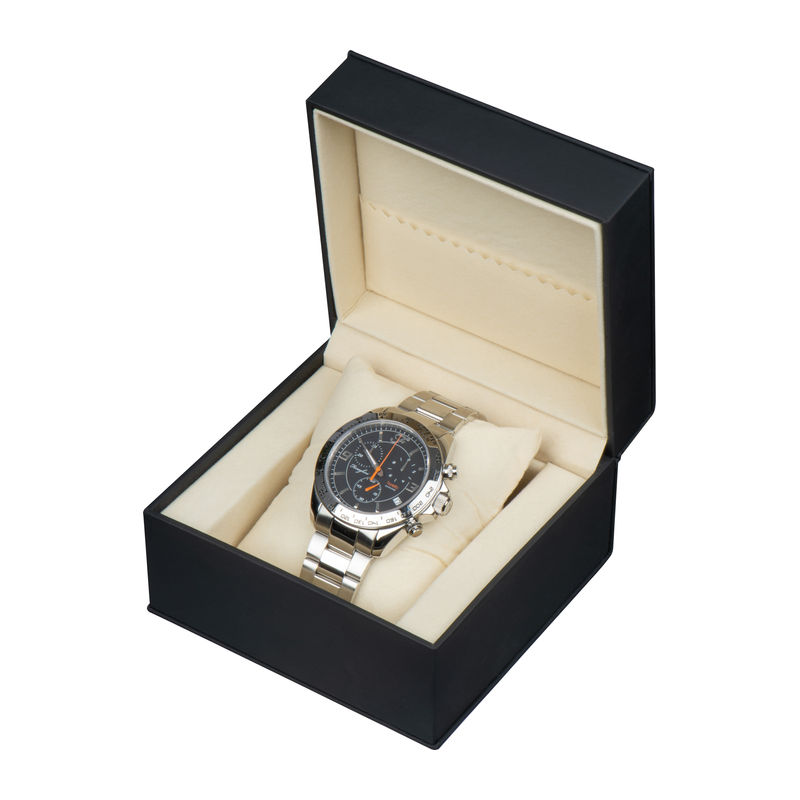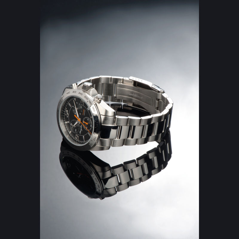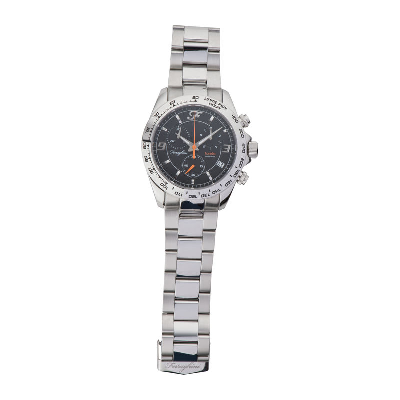TORELLO - classic, sportive design paired with Swiss precision. This Swiss chronograph with large display (42mm width) has all features for sporty people: second hand, stop watch, date, speedometer, saphire glass, 100 meters waterproof (10 ATM), hypoallergenic stainless steel housing, stainless steel wristband and flap closure.