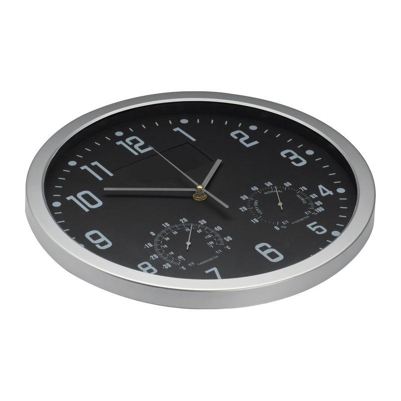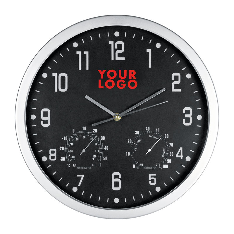 Exclusive, pioneering CrisMa design wall clock, featuring hygrometer and thermometer. We will print your logo on the removable plate.
