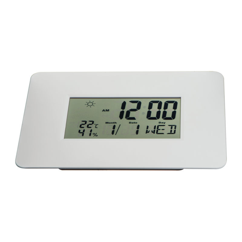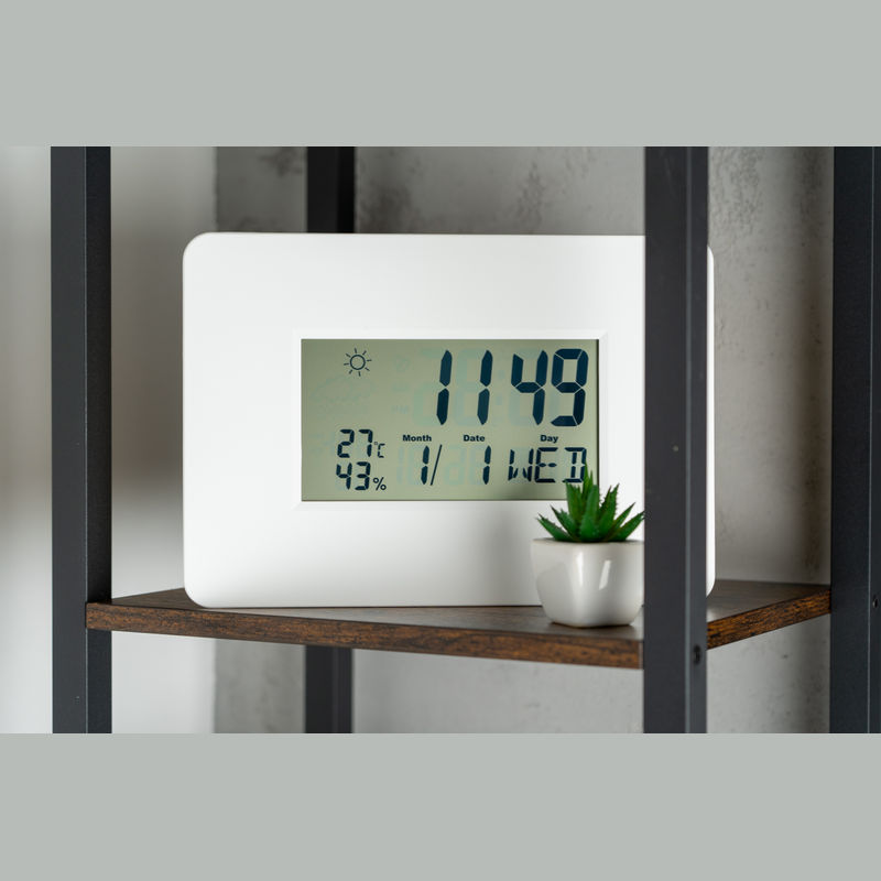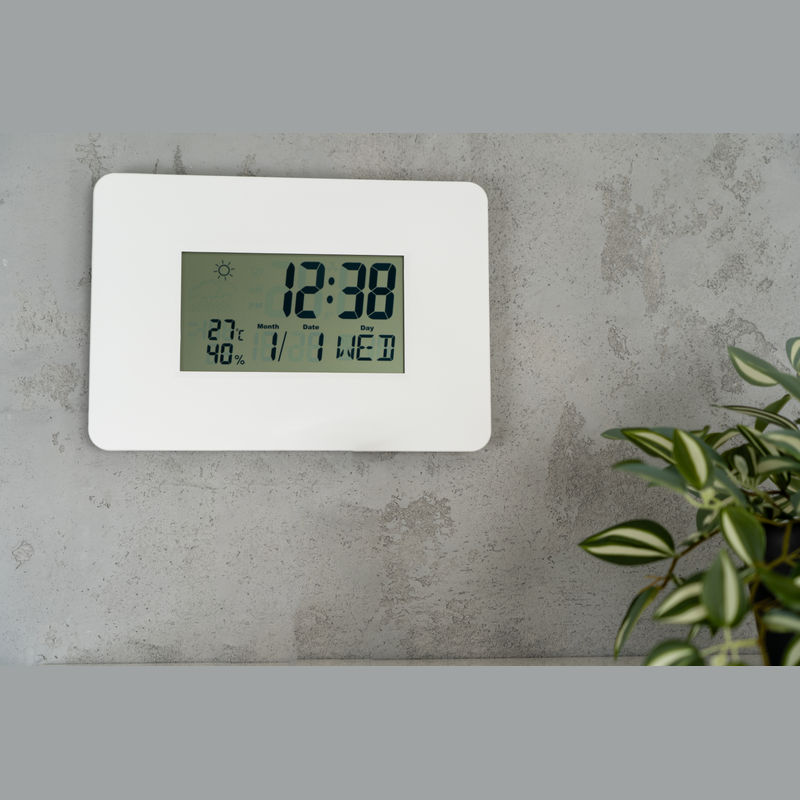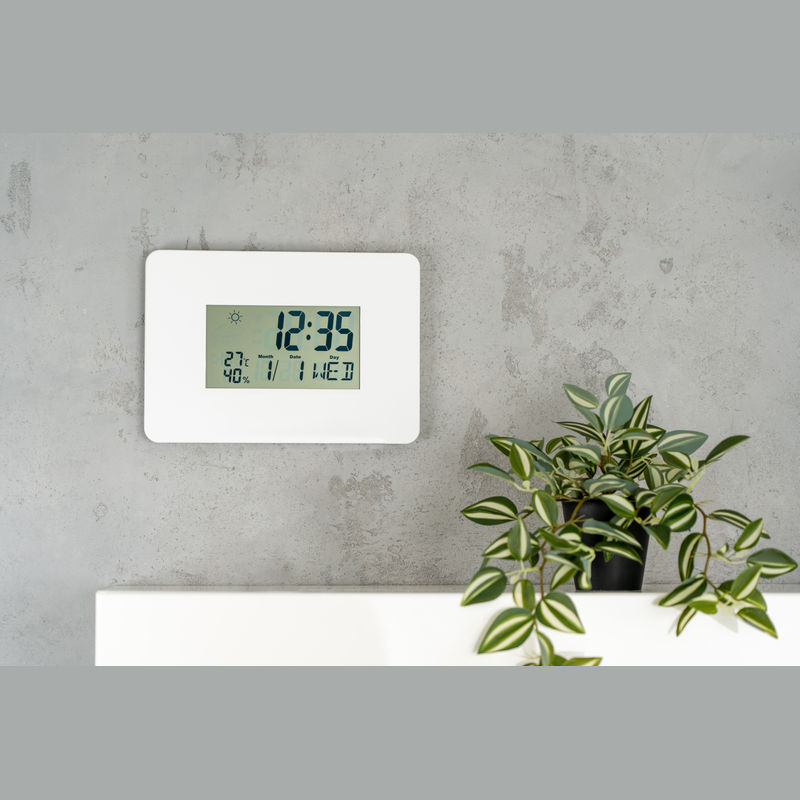 Digital wall clock featuring a calendar, alarm with snooze function, thermometer, hygrometer (automatic updates every 20 seconds), and weather display. Requires AAA battery, which is not included.