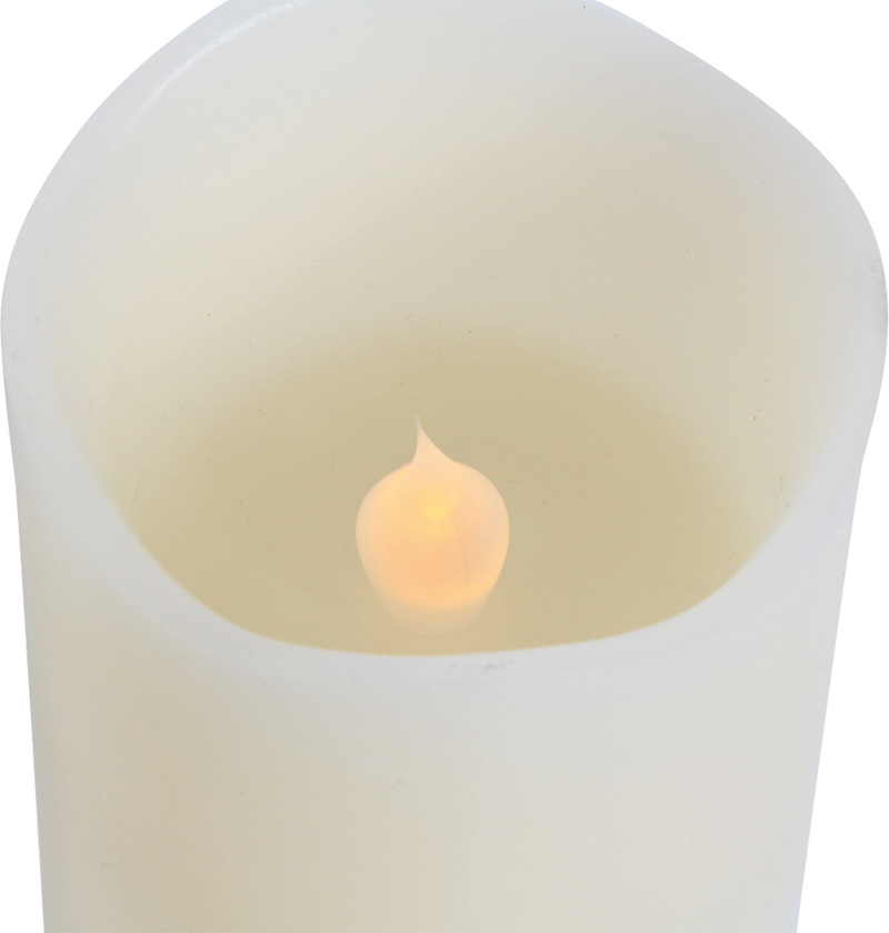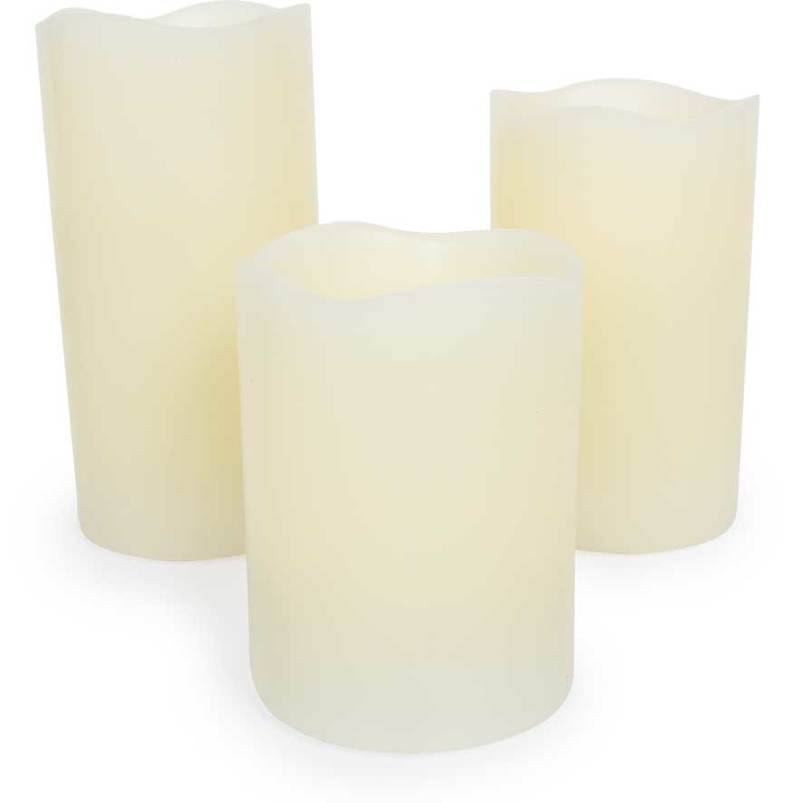 These three creamy-white candles of different sizes and made up of pure wax donate a warm, pleasant light through LED lights. Batteries not included.