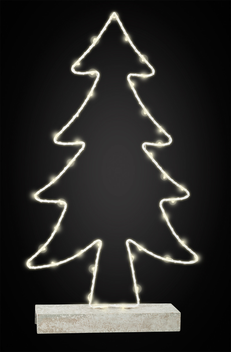 A Christmasy glow! The filigree illuminated metal fir tree is an attractive decoration for the Advent season. The LED lighting wrapped around the tree gives it a Christmas charm. Pedestal with a cement appearance. Batteries not included. An enrichment to every Christmas decoration.