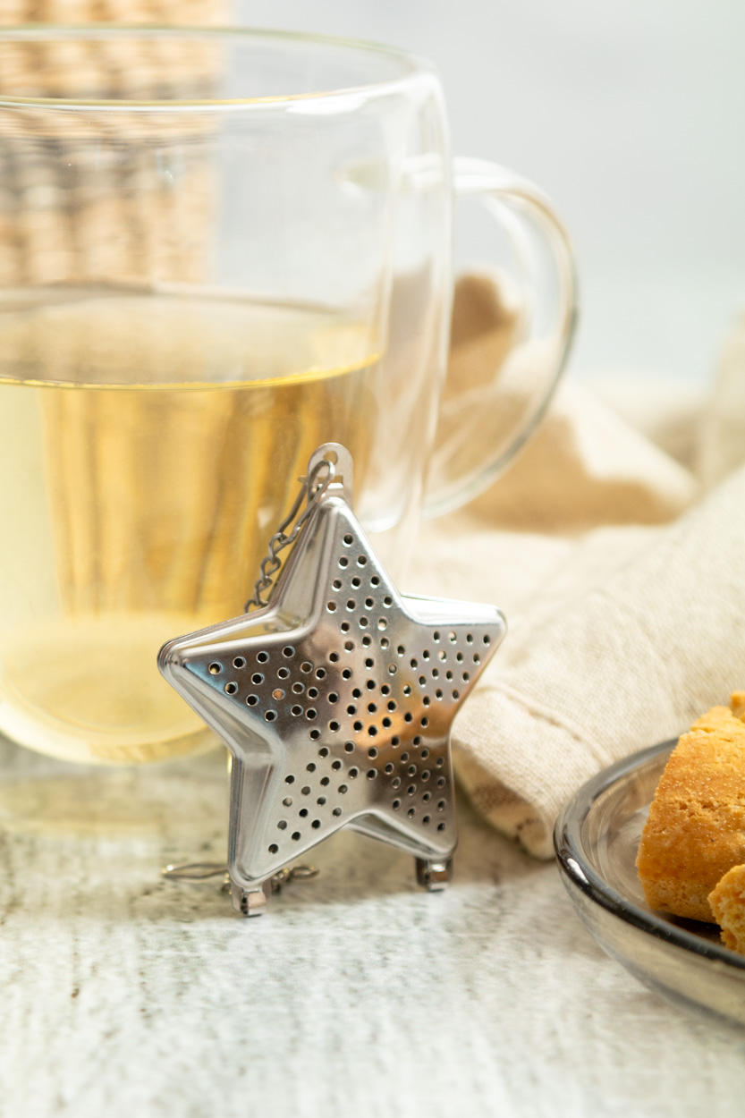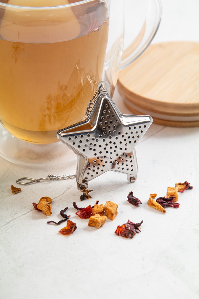 Stainless steel Christmas tea infuser with chain and clip. With printable area on one side.