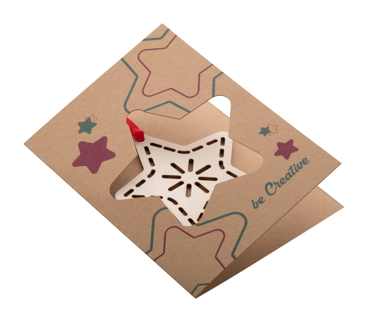 Custom made kraft paper Christmas card with custom graphics on both sides, including Christmas tree ornament in wood pulp board with red ribbon. Including C6 postal envelope. MOQ: 100 pcs.
